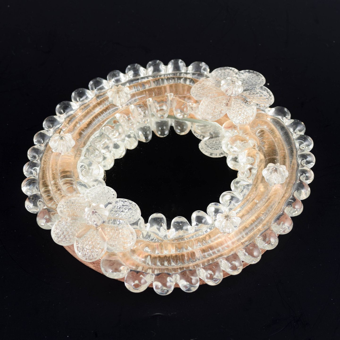 Murano, spejl.Lille dekorativt vægspejl med ramme af håndformet Murano-glas i varme rosétoner og klart glas. Rammen er opbygget af påsatte blomster- og knopformer med rillet og boblet struktur, typisk for venetiansk glasdesign fra midten af det 20. århundrede. Spejlglasset er indfældet centralt i den plastiske glasramme.