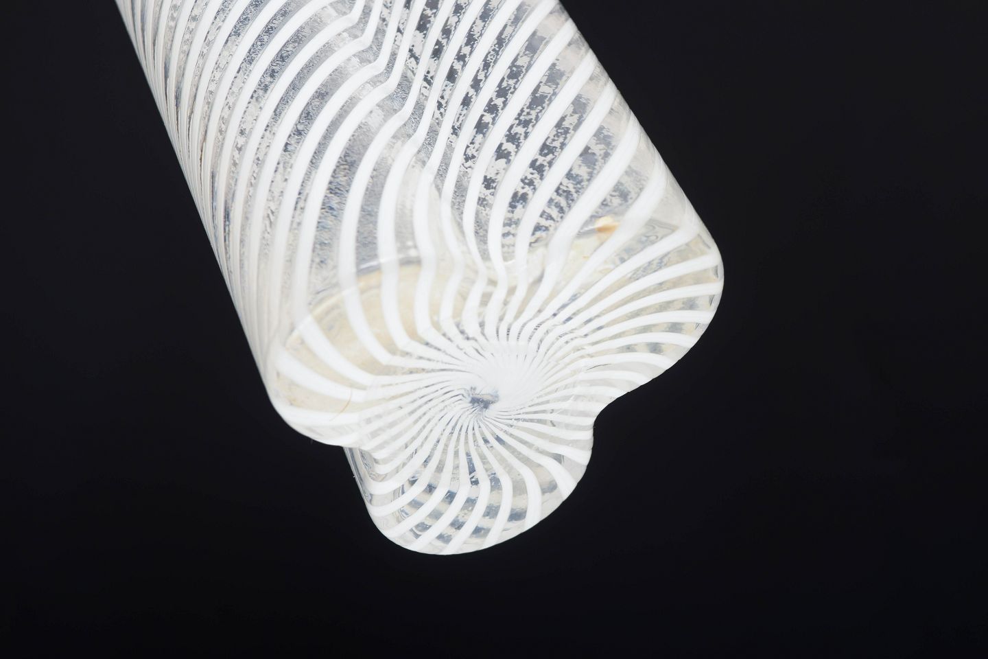 Heikki Orvola for Nuutajärvi, vase.Slank flaskeformet vase i klart kunstglas med indlagt hvid spiral- og trådmønster udført i lagdelt teknik. Modellen er mundblæst og fremstår med original Nuutajärvi 1793 Wärtsilä Finland-klistermærke samt signering. Formen og den optiske dekoration er karakteristisk for finsk kunstglas fra 1970’erne.
