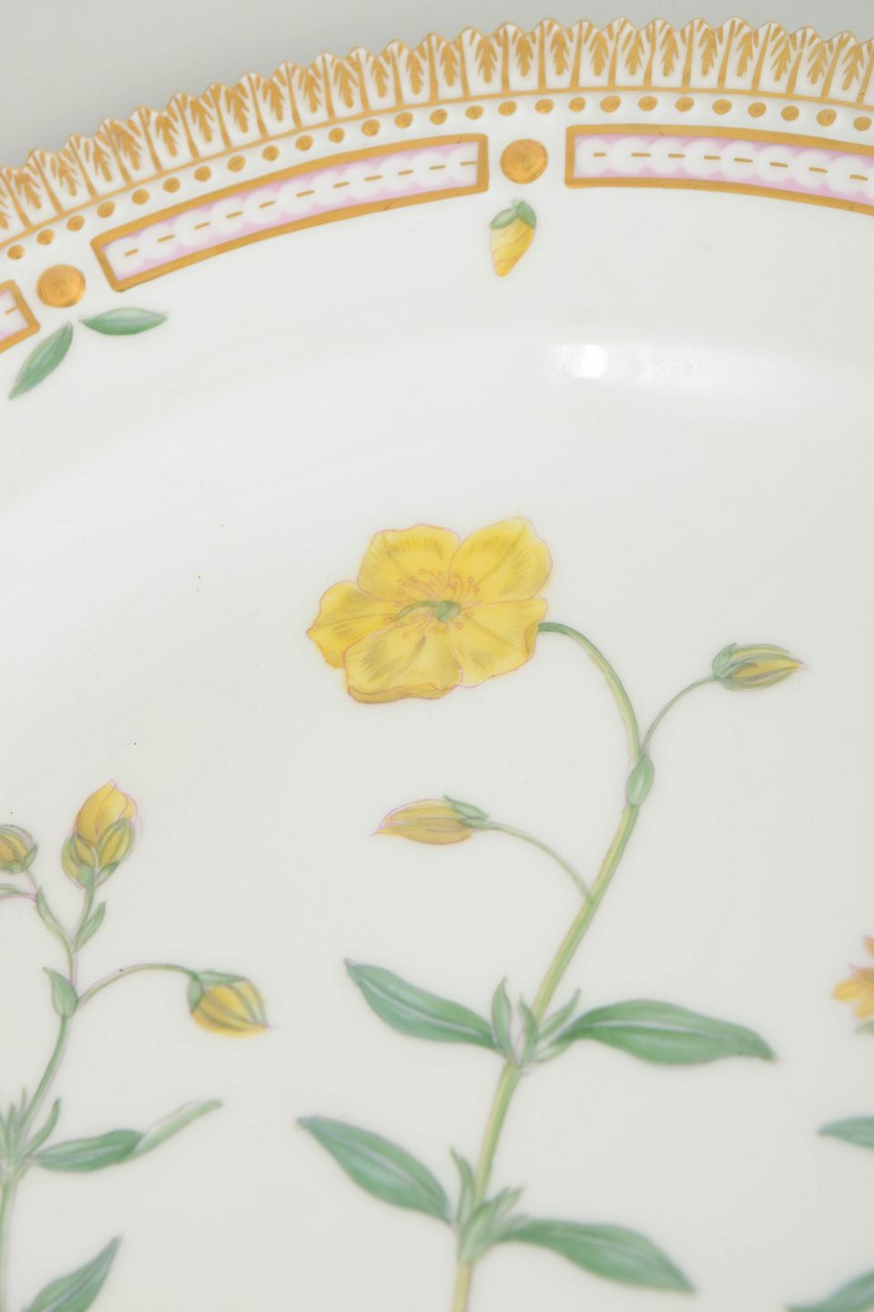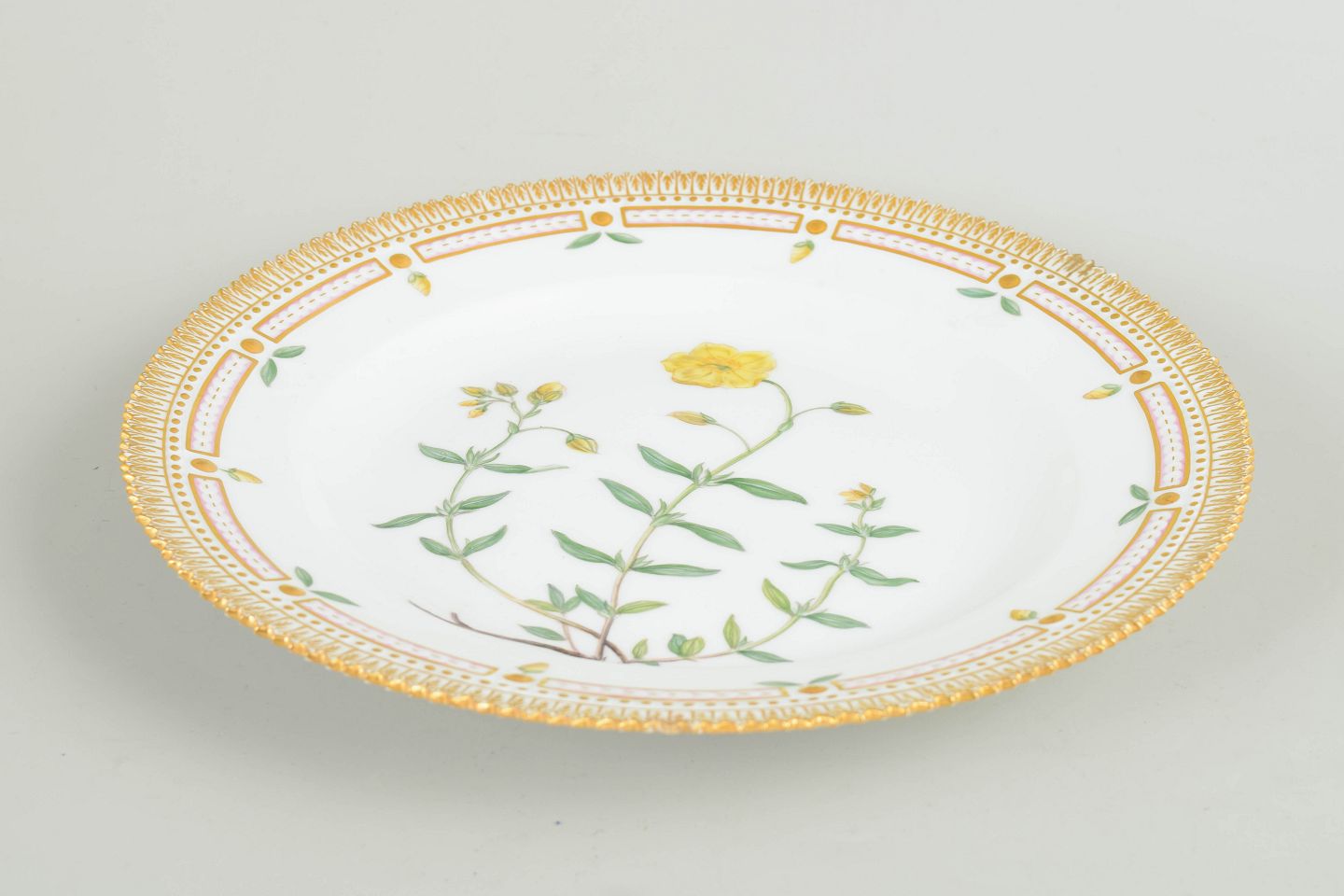 Royal Copenhagen, Flora Danica middagstallerken.Middagstallerken i porcelæn med håndmalet botanisk motiv fra det eksklusive Flora Danica-stel, udført i naturalistiske farver og indrammet af rigt forgyldt bort.