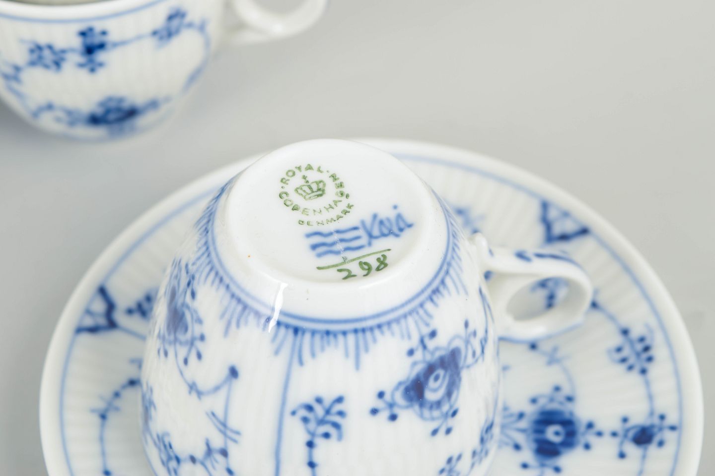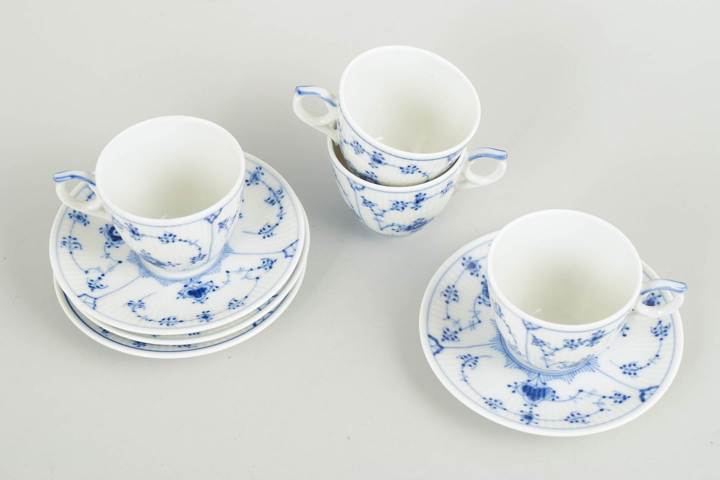 Royal Copenhagen, Musselmalet riflet kaffekopper med tilhørende underkopper, sæt af 4.Sæt bestående af fire kaffekopper med tilhørende underkopper i glaseret porcelæn, dekoreret med håndmalet underglasur i det klassiske musselmalede mønster. Model 1/298.