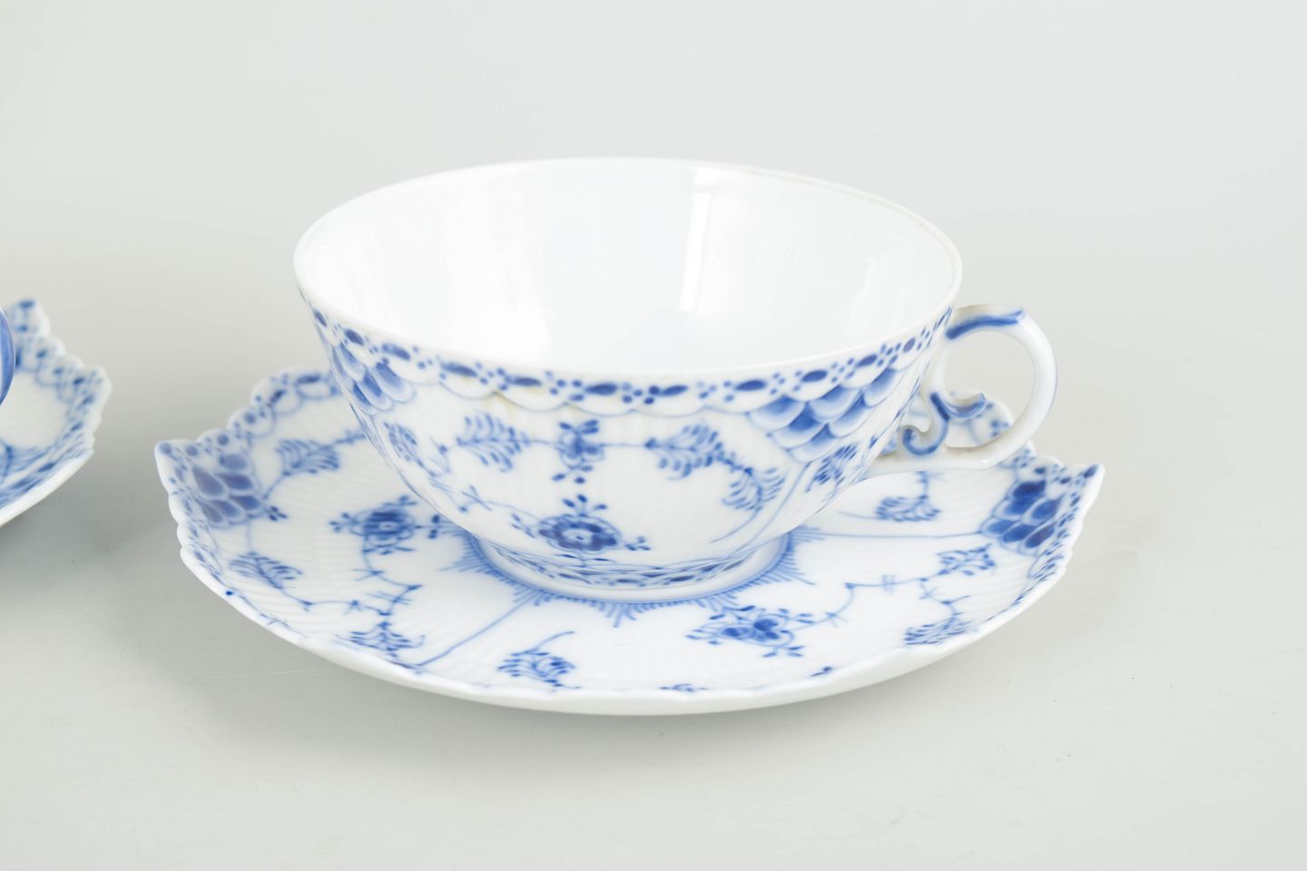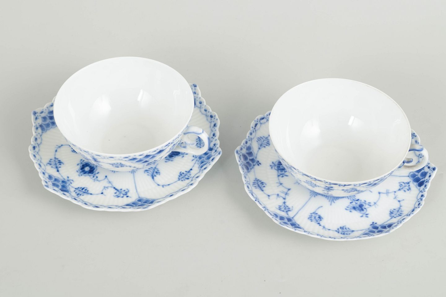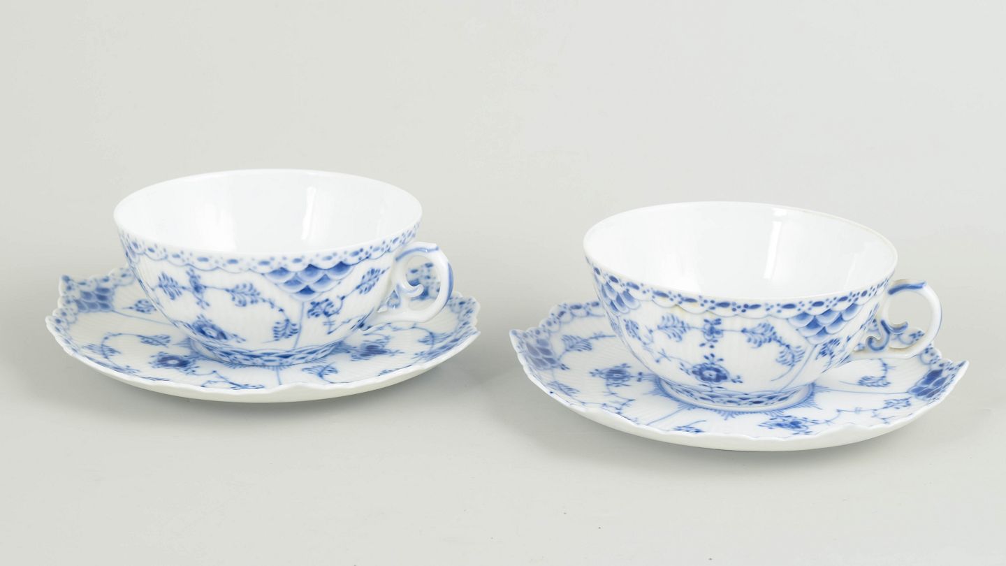 Royal Copenhagen, Musselmalet helblonde tekopper med underkopper, sæt på 2.To tekopper med matchende underkopper i håndmalet underglasurblå dekoration i Musselmalet helblonde, med gennembrudt blondedekoration langs kant. Kop og underkop model 1/1130. Annulleret med én og to indridsede streger.