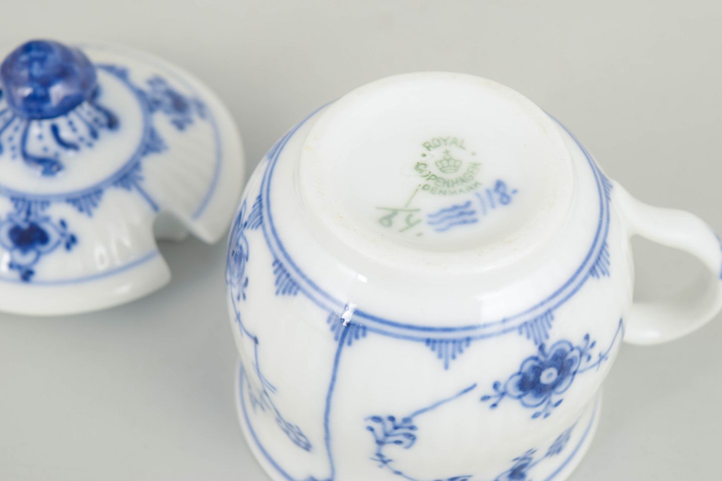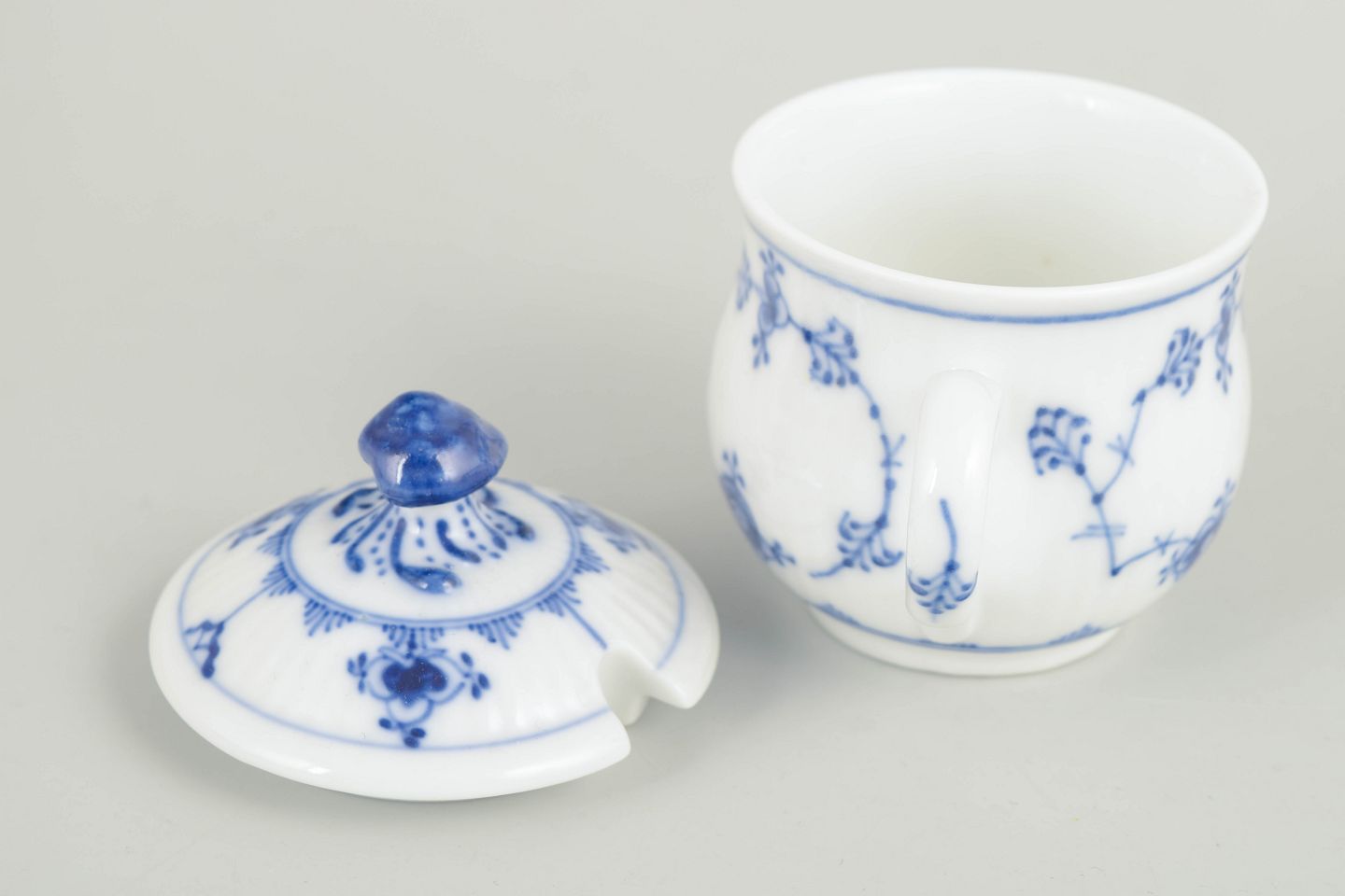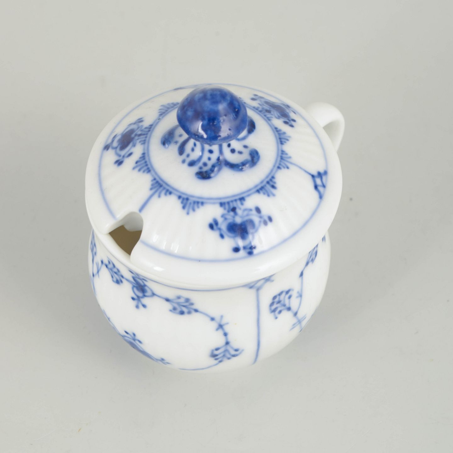 Musselmalet riflet er Royal Copenhagens ældste stel, introduceret i 1775. Dekorationen udføres i frihåndsmalet kobolt under glasuren, hvilket giver levende variationer i streg og farve. Cremekopper med låg var en fast del af det klassiske bord i slutningen af 1800-tallet og begyndelsen af 1900-tallet og afspejler tidens formelle serveringskultur og høje porcelænshåndværk.