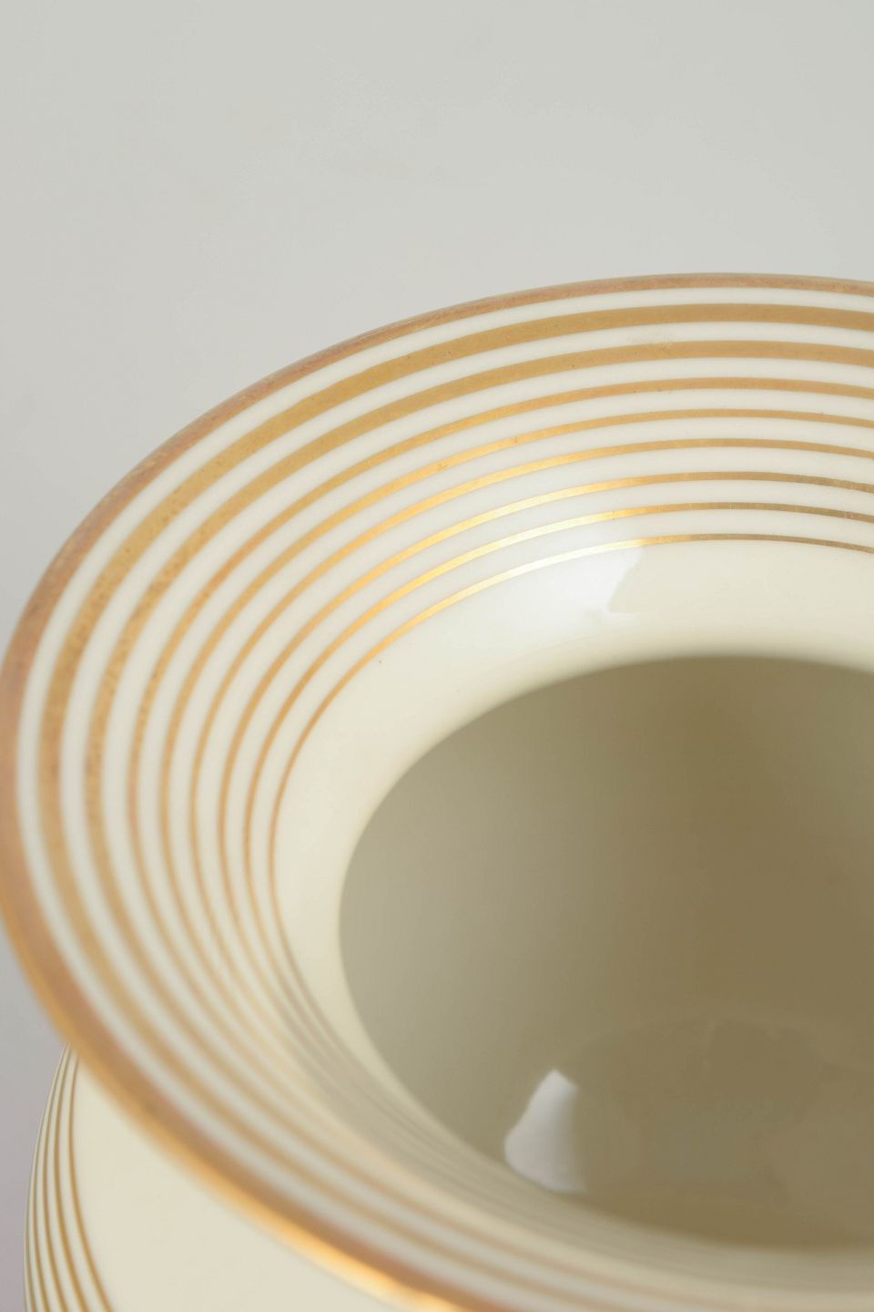 Johann Seltmann Vohenstrauss, art deco vase.Art deco–formet porcelænsvase med balusterkrop, flad fod og udadbøjet munding. Dekoreret med brede horisontale bånd i rød og elfenbenshvid med forgyldte linjer. Underglasur fabriksstempel “Johann Seltmann Vohenstrauss Bavaria” under bunden.