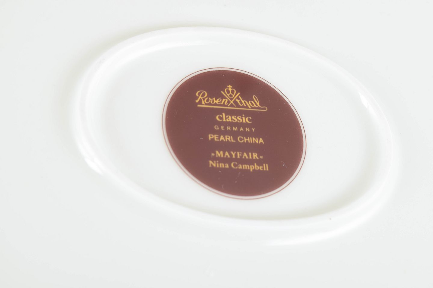 Nina Campbell for Rosenthal, to ovale fade.Sæt med to ovale fade i porcelæn fra Rosenthal Classic, dekoreret i serien Mayfair med mørk bort, stiliserede grønne bladranker og gulddetaljer, produceret i 1980’erne.