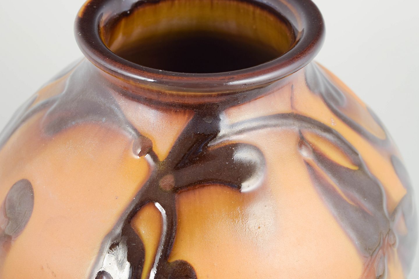 Kähler, stor vase i kohorn-teknik.Stor rundbuet vase i glaseret stentøj udført i den karakteristiske ko horn-teknik, hvor flydende glasurer i varme rav- og bruntoner er trukket og manipuleret i bløde, organiske bevægelser over overfladen. Modellen er udført i en generøs størrelse, som fremhæver glasurens dybde og levende spil.
