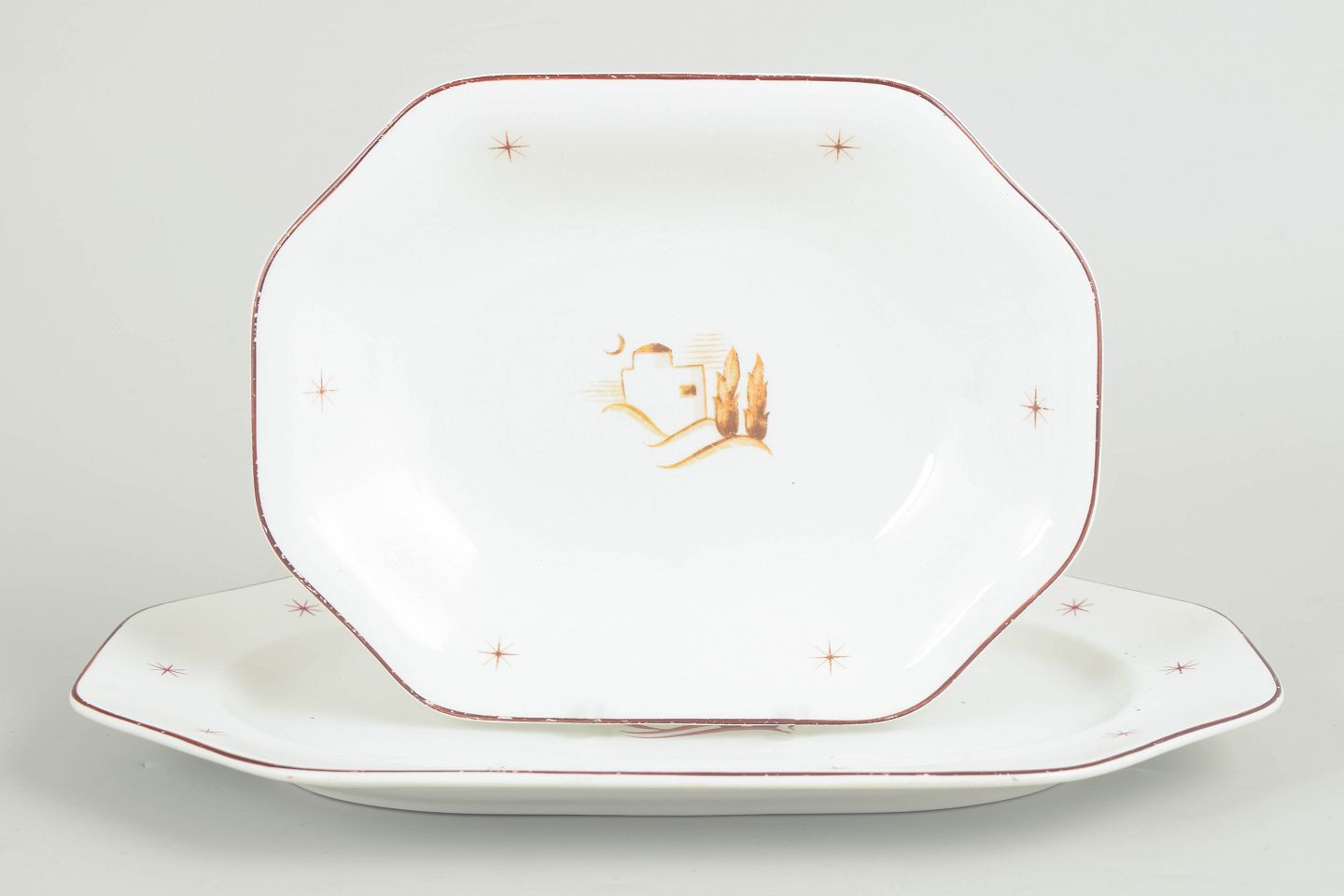 Arabia, Orient, to fade.Fade i glaseret fajance med bølget form, brun kantstreg og stjernemotiver samt centralt orientalsk landskabsmotiv. Model Orient. To størrelser.