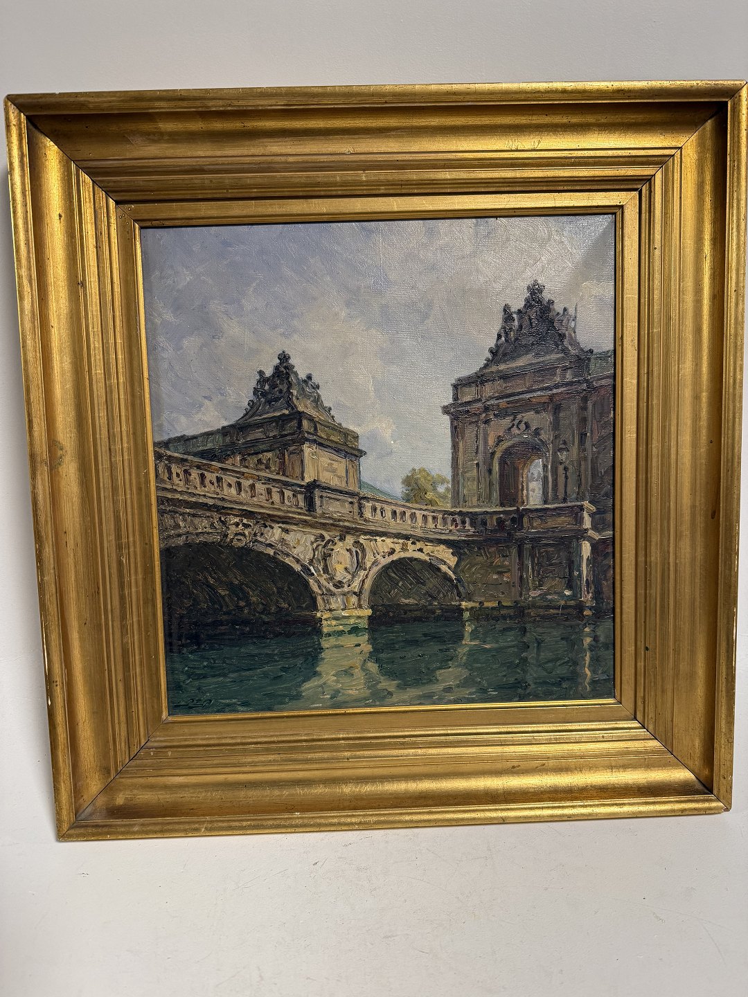 Peter Elias Petersen (1859-1950), Marmorbroen ved Christiansborg i København med godt lys over bro og vand, Signeret P.E.P. og bag på påskrevet P. E. Peteresen 1922, Mål med ramme: 46,5x44,5cm *Fin stand*Lager: 1