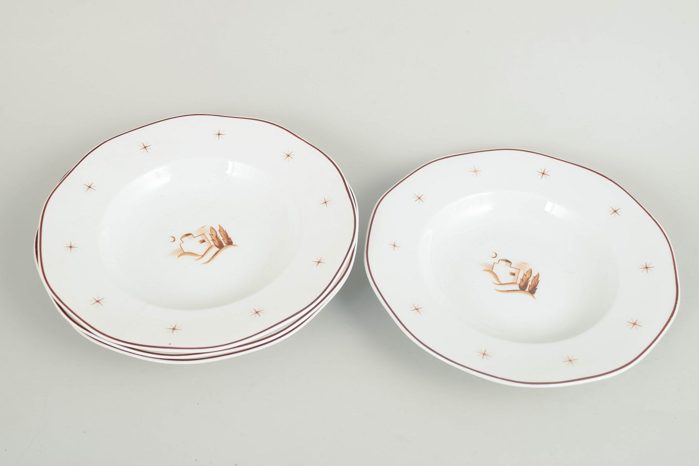 Arabia, Orient, sæt med 4 dybe tallerkener.Dybe tallerkener i glaseret fajance med bølget fane, brun kantstreg og stjernemotiver samt centralt orientalsk landskabsmotiv. Model Orient.