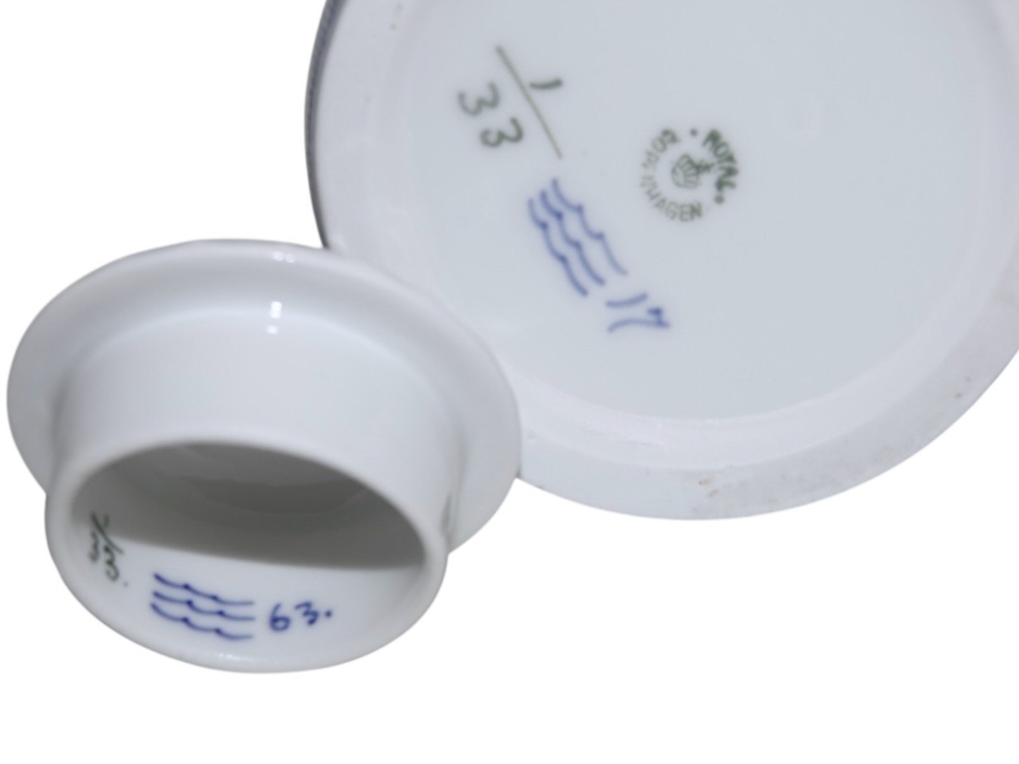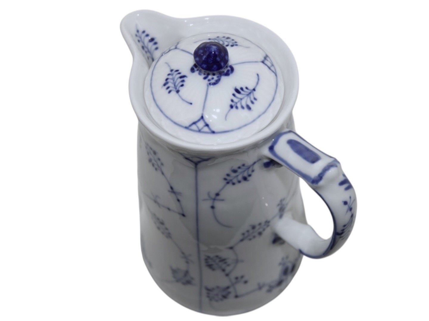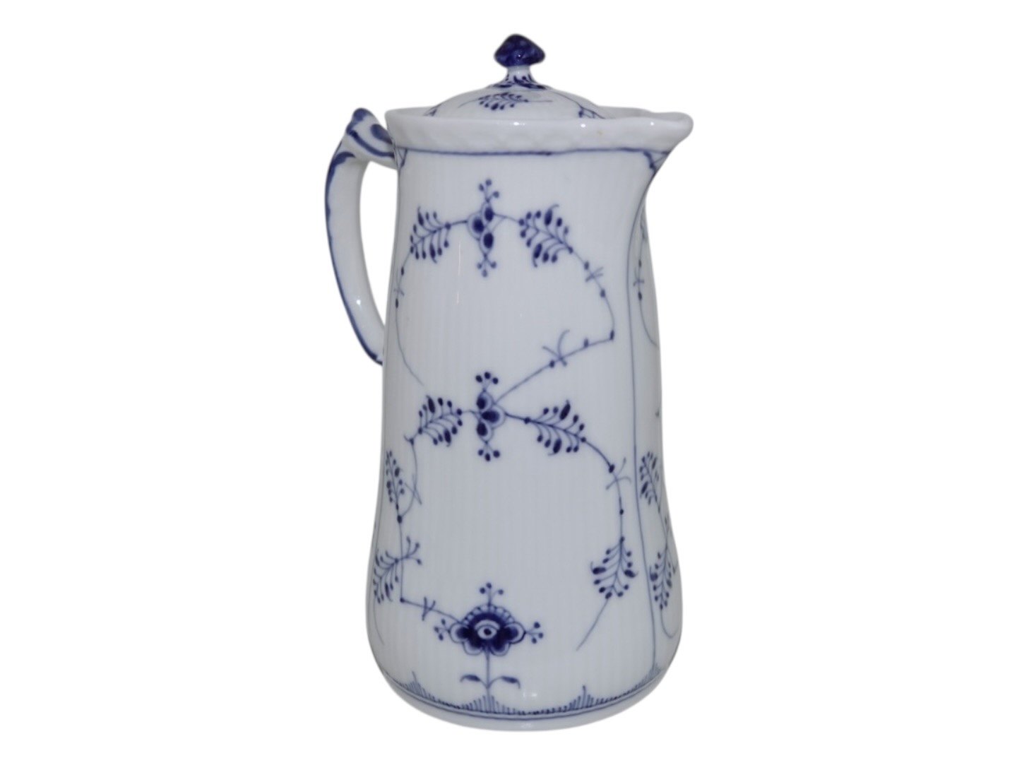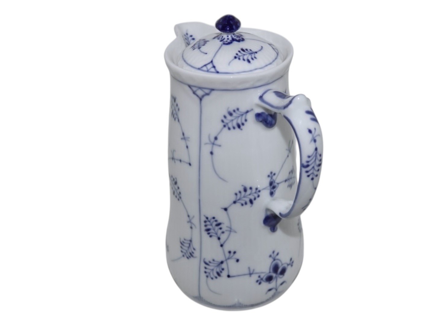 Royal Copenhagen Musselmalet Riflet, sjælden chokoladekande med tilhørende låg.Fabriksmærket viser, at denne er produceret mellem 1898 og 1923.
