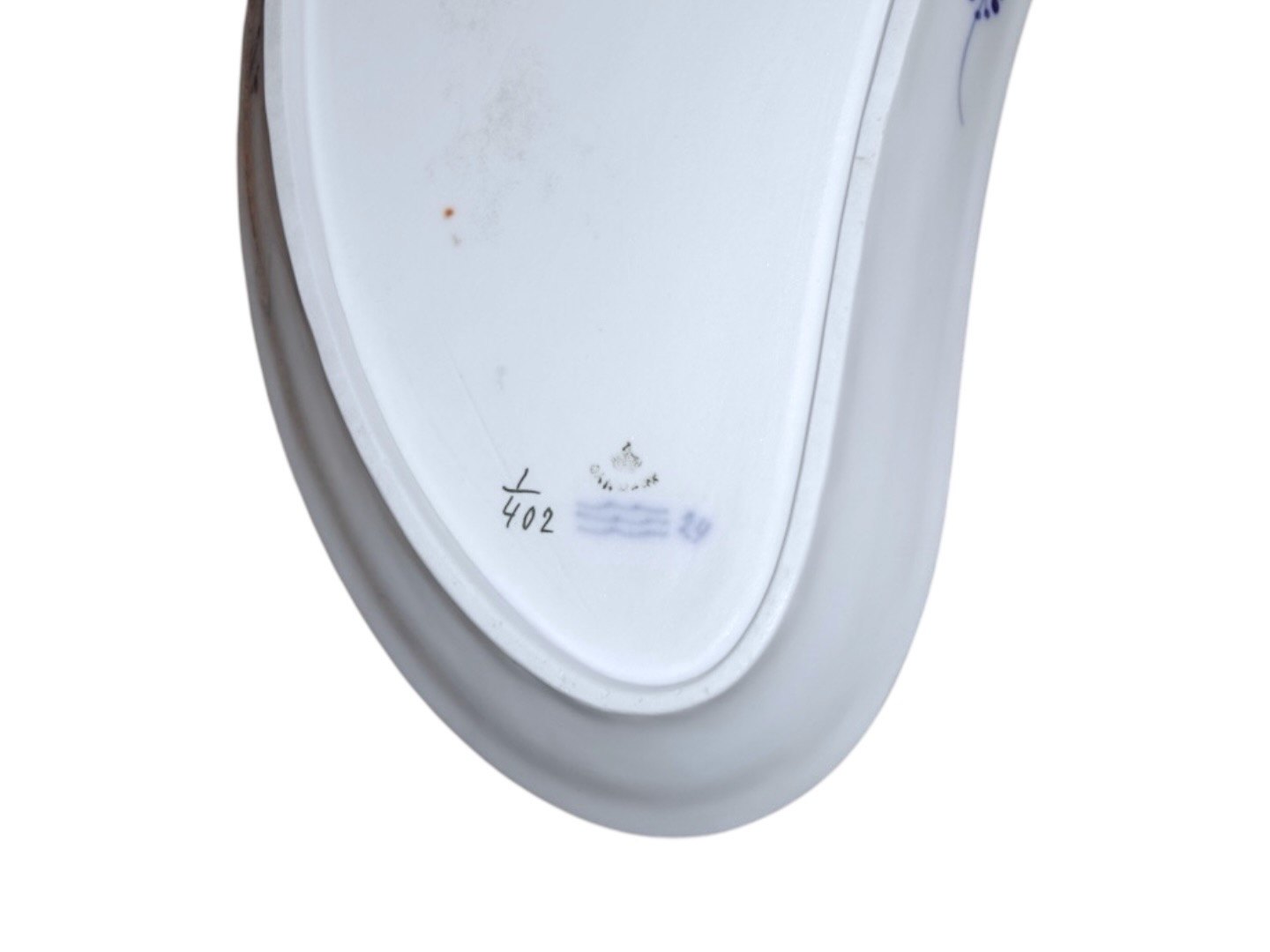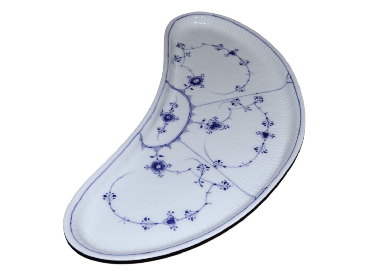 Royal Copenhagen Musselmalet Riflet, stort og meget sjældent måneformet anretterfad.Dekorationsnummer 1/402.