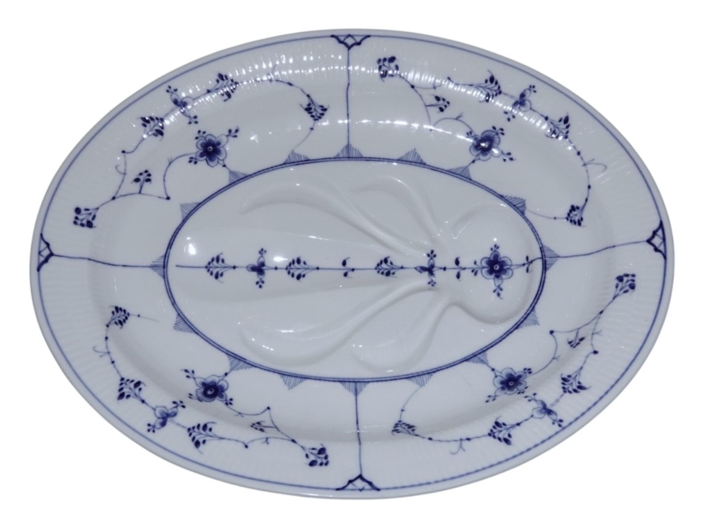 Royal Copenhagen Musselmalet Riflet, stort og sjældent fad til en steg, hvor kødsafterne kan løbe ned i fordybningerne.Ud fra fabriksmærket kan det udledes, at denne er produceret før 1894.