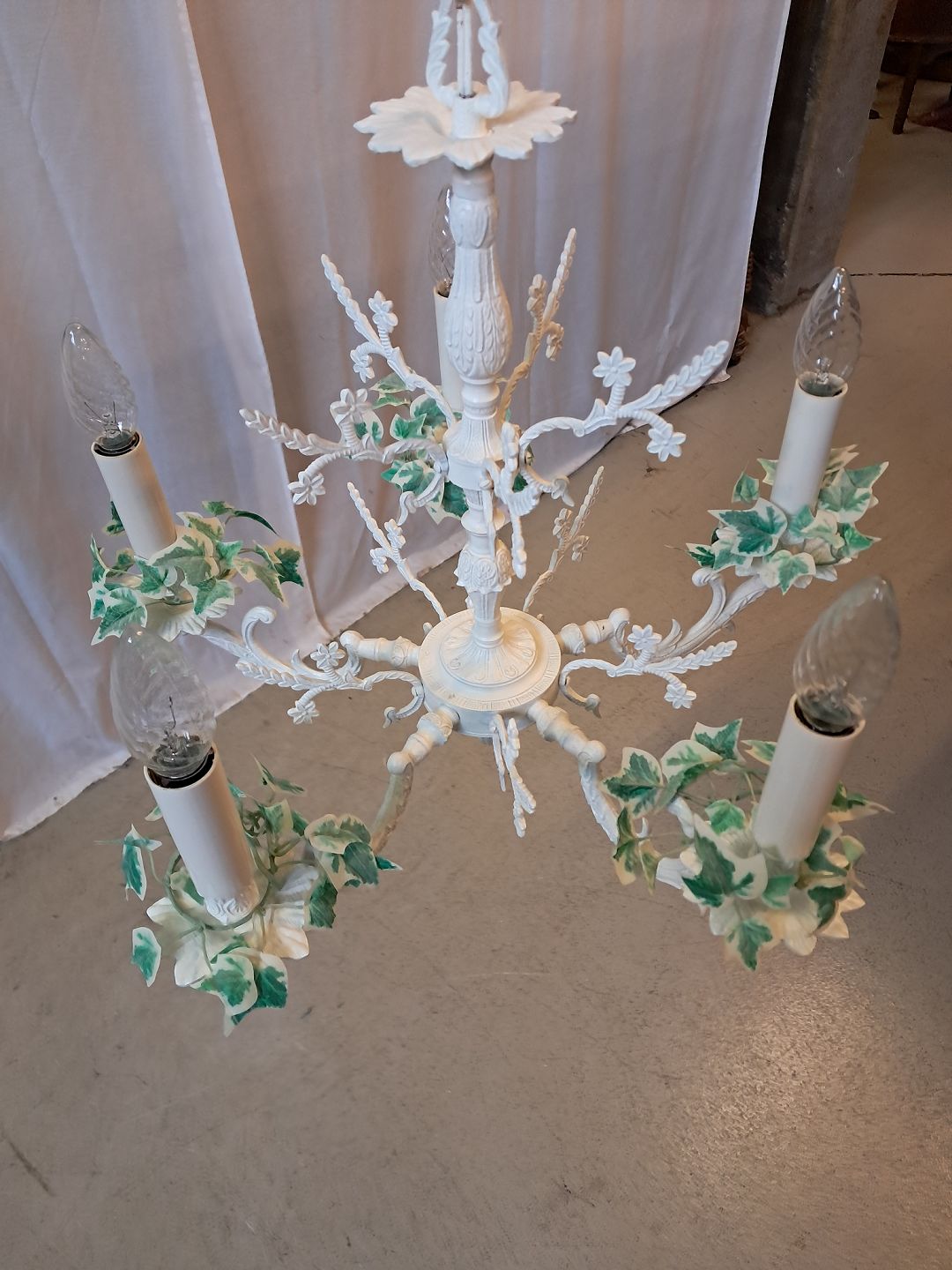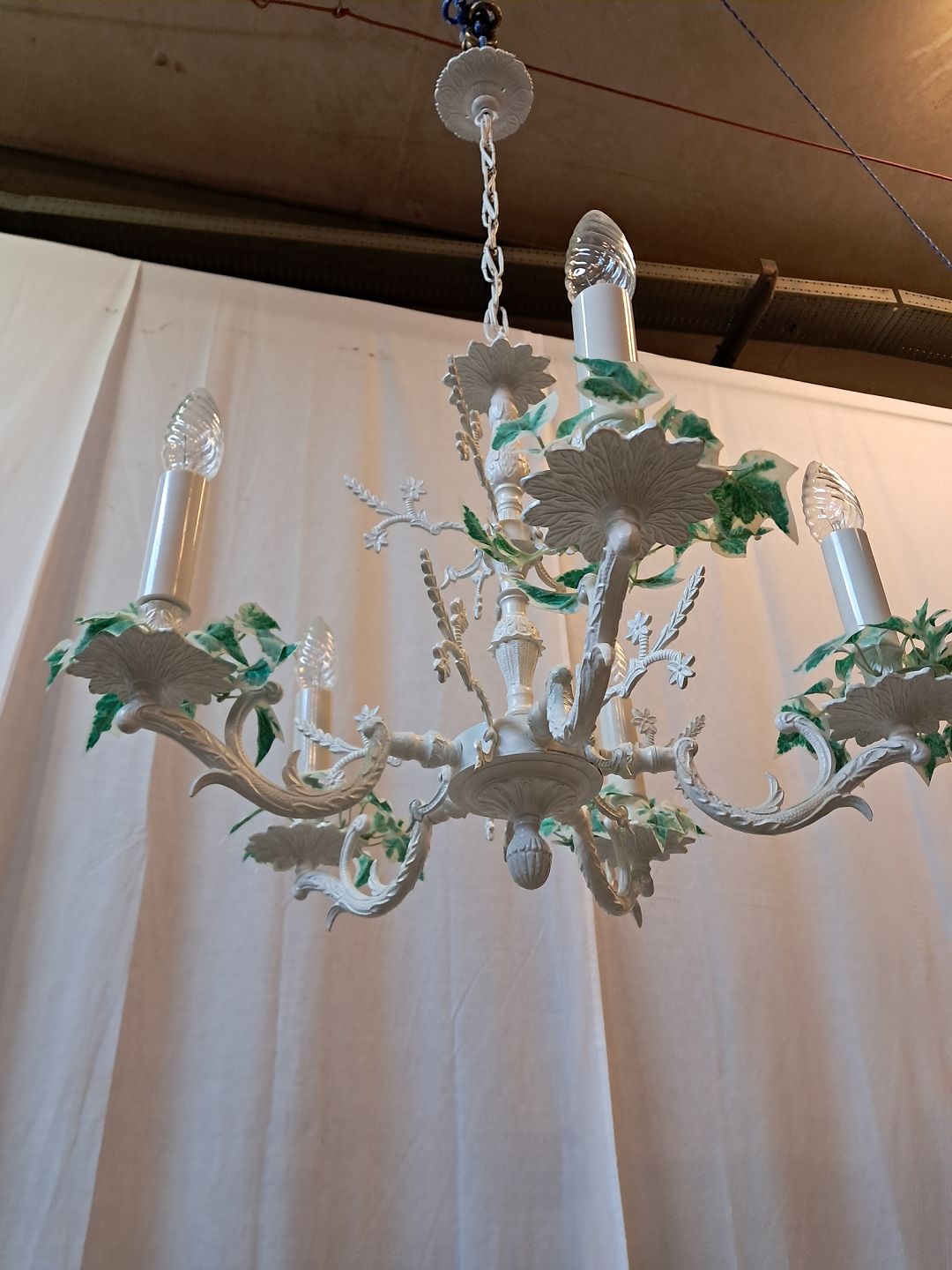 Lysekrone i malet metal, fra 1980erne.Den har brugsspor.