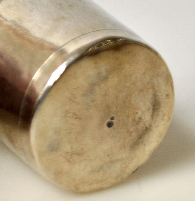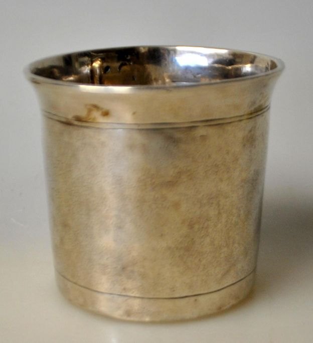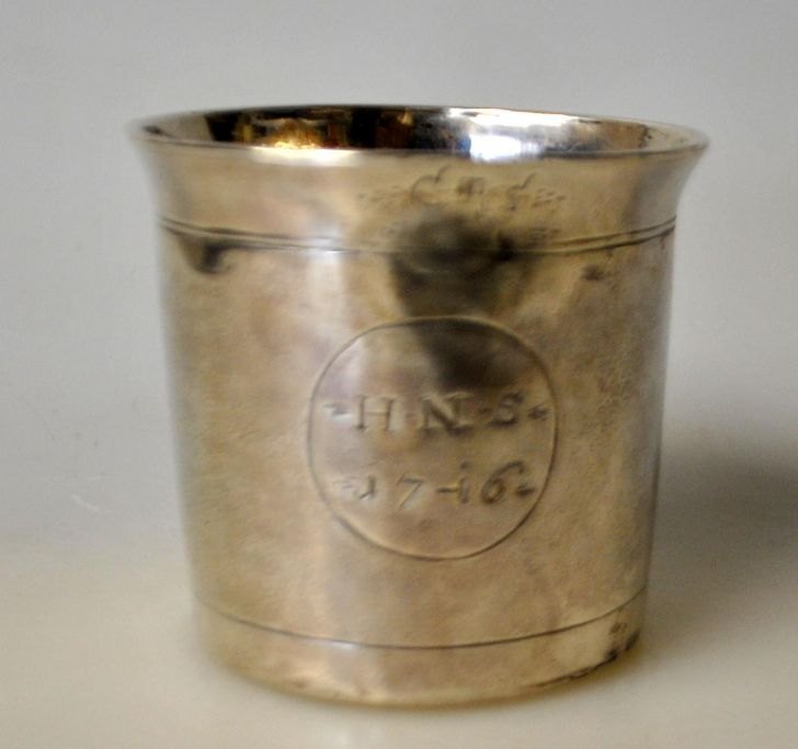 Dansk barokt sølvbæger, 1716. Med graveringer: H.N.S 1716 og senere: CRS. Ingen synlige mestermærker. I bunden indgraveringer. H.: 5,3 cm. Vægt: 52 gram.Emne nummer: 28978