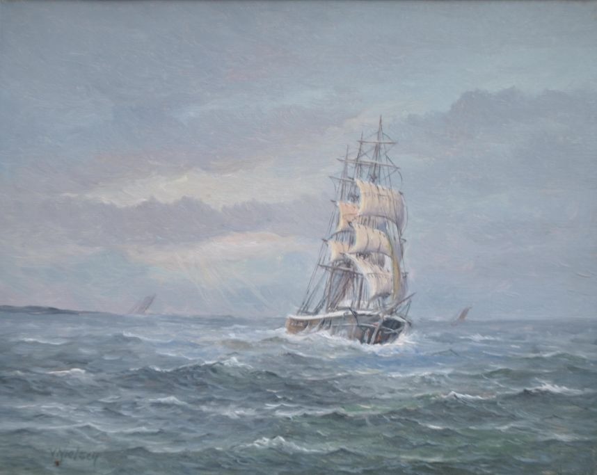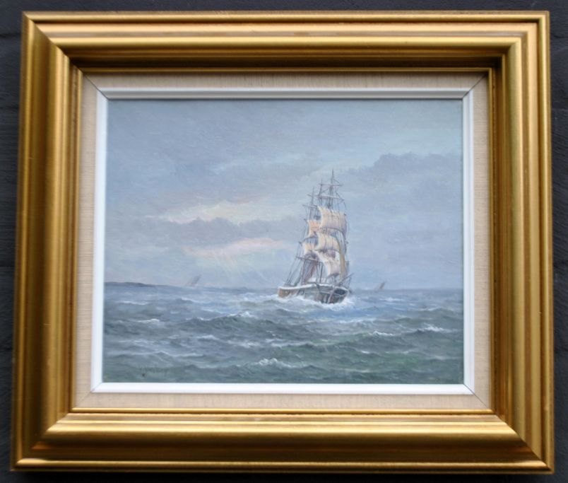 Nielsen, Verner (1910 - ) Danmark: Marine med sejlskibe. Olie på lærred. Signeret. 24 x 30 cm.Indrammet: 37,5 x 43,5 cm.