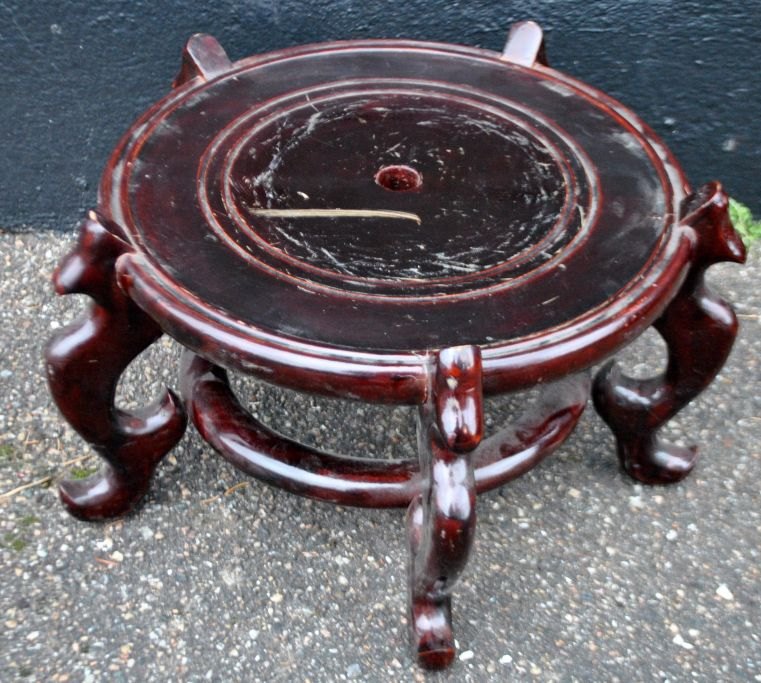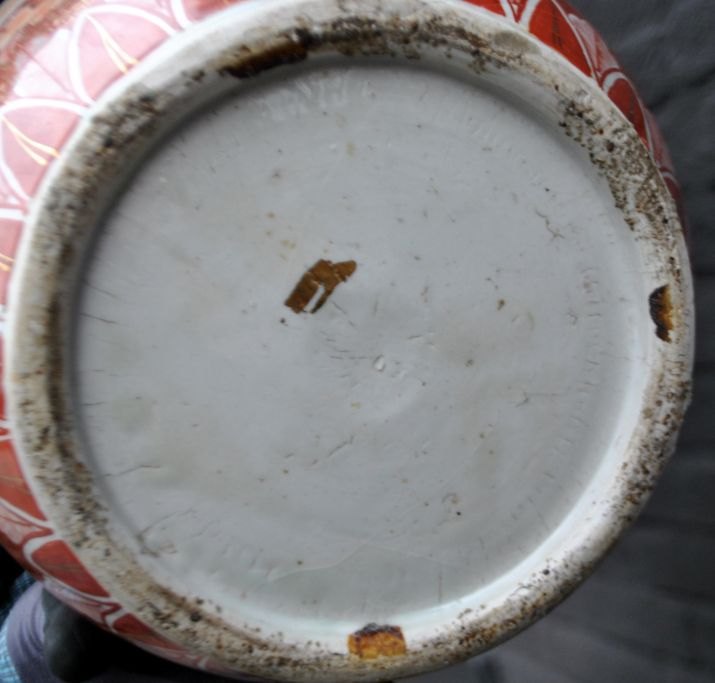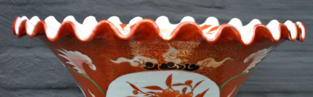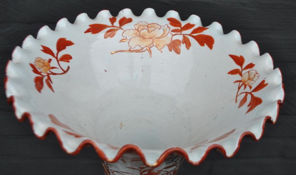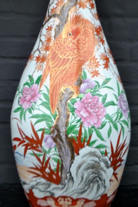 Japansk Kutani vase, 19. årh. Håndmalet. Dekoreret med bl.a. træer, blomster og fo fugl. Polykrom dekoration med forgyldninger. Bølget kant. H: 94 cm. Dia: 33,5 cm. H. inkl. fod: 113,5 cm.På træfod.