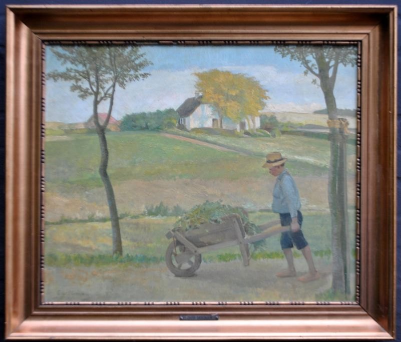 Sørensen, Eiler (1869 - 1953) Danmark: Landskab med dreng med trillebør. Olie på lærred. Signeret: Eiler Sörensen. H: 52 cm. B: 65 cm.Indrammet: H: 66 cm. B: 77 cm.