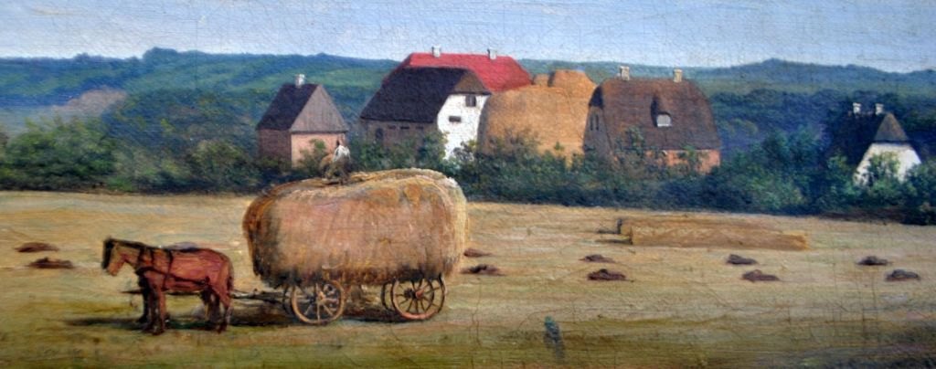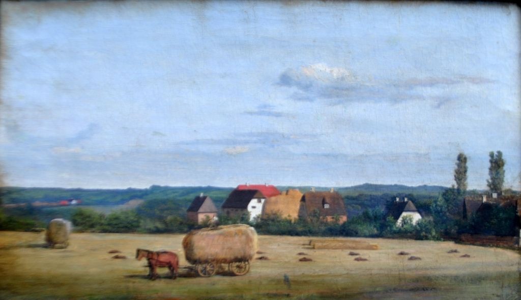 Rademacher, Niels Grønbek (1812 - 1885) Danmark: Høstscene fra en sjællandsk herregård. Olie på lærred. Svagt signeret. 19 x 32,5 cm.Indrammet: 29 x 42 cm.