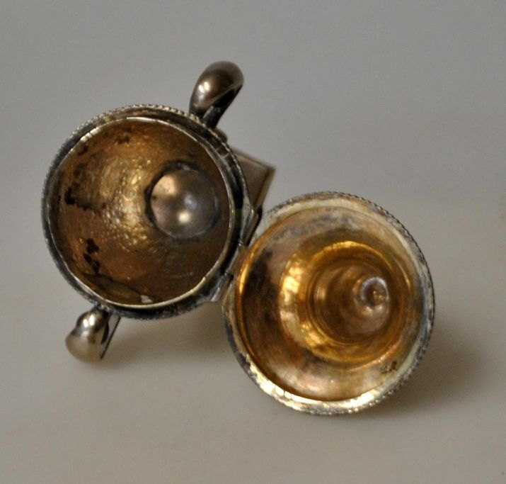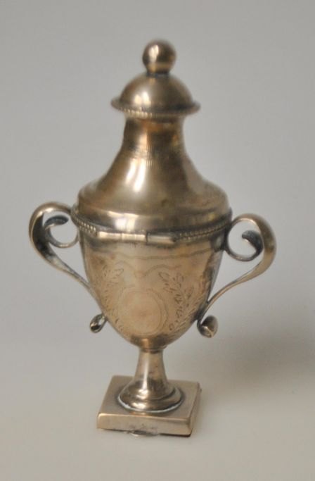 Mathias Lind (1831 - 1920) Ringkøbing, Danmark: Hovedvandsæg i sølv. Senempire. Vaseform. 1871. Indvendig lueforgyldt. Stemplet i balsamgemmet. H.: 10,5 cm. Med indgravering: B. K. Andersen Holck 1871.Emne nummer: 28872