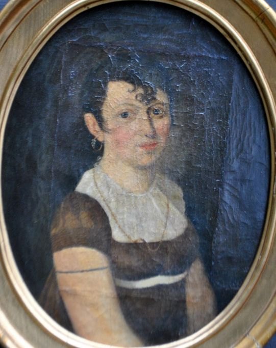 Dansk empire portrætkunstner (19. årh.): Portræt af en ung kvinde. Oval. Olie på lærred. 56 x 44 cm.I oval samtidig forgyldt ramme. 75 x 59 cm.