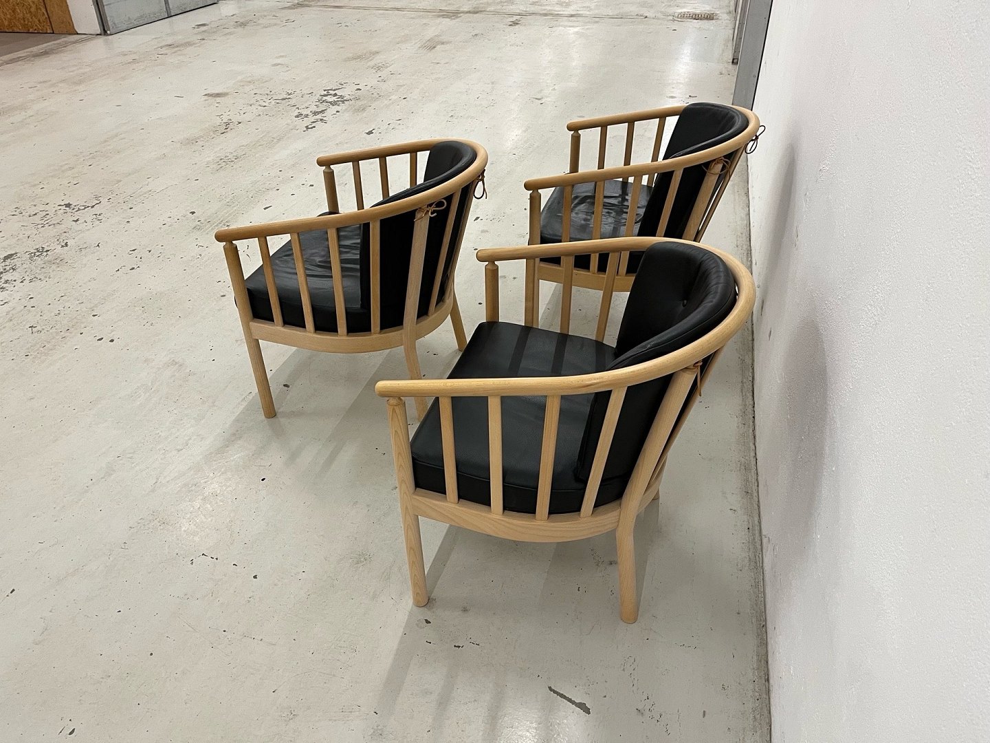Der udbydes i alt 3 stk. Stouby Bella loungestole udført i sort semianilinlæder med stel i ubehandlet eg.