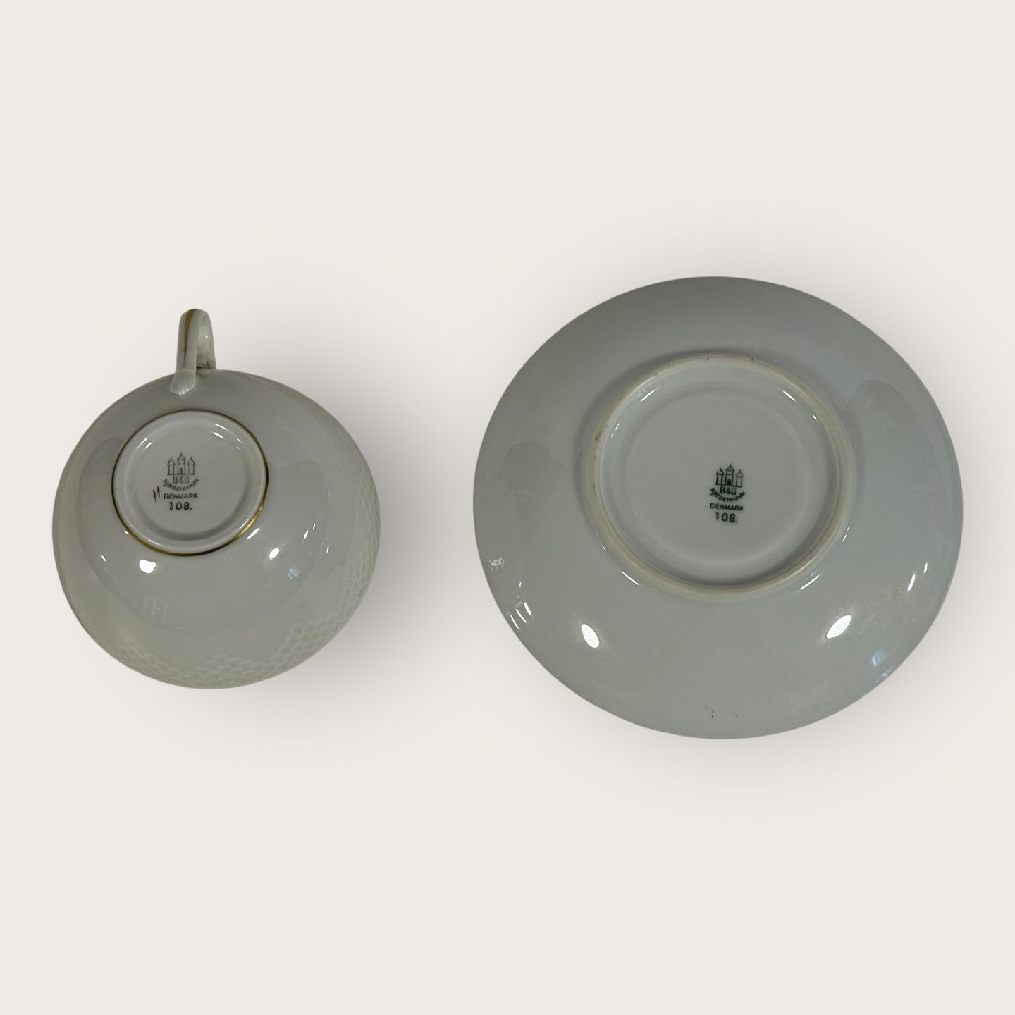 Bing & Grøndahl, Aakjær, Hvid porcelæn med guldkant, Tekop sæt #108, 5cm høj, 10cm i diameter, 1.sortering *Pæn stand*Lager: 3