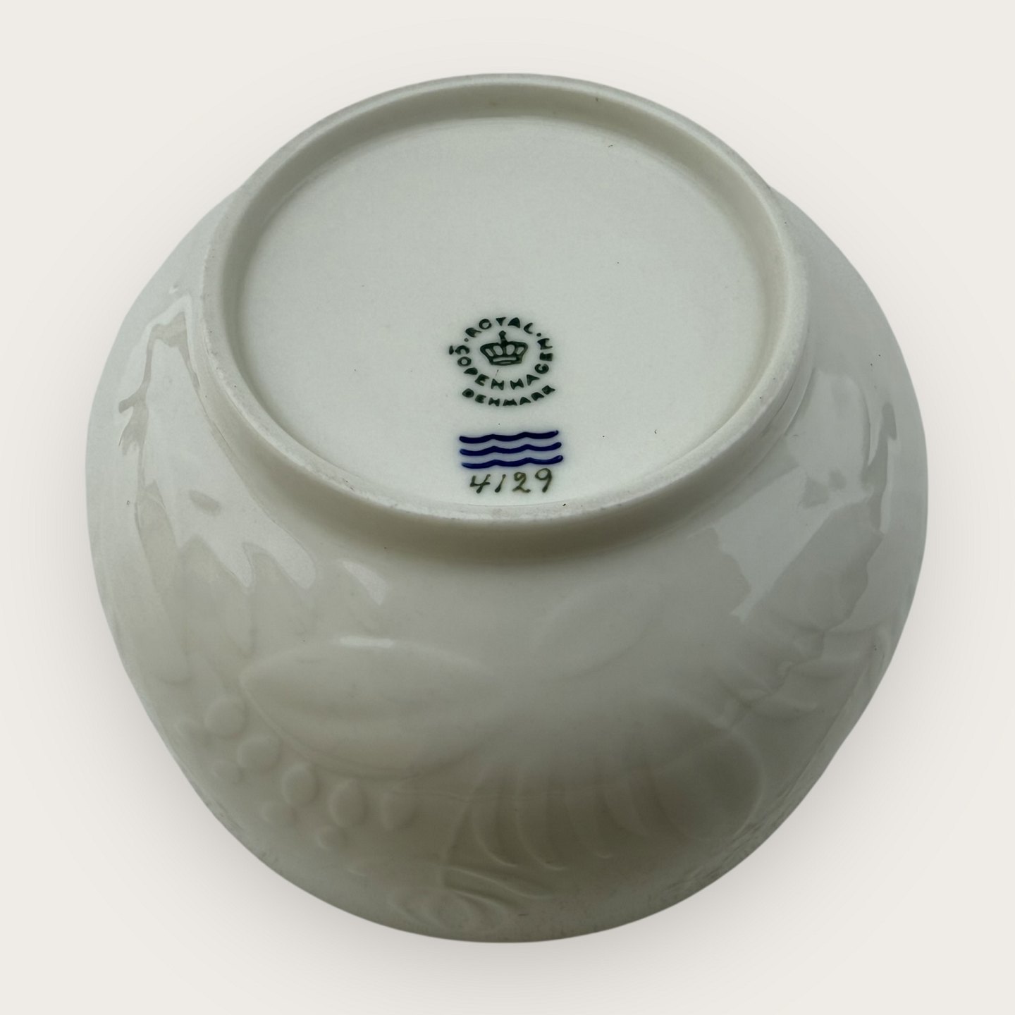 Royal Copenhagen, #4129, skål i blanc de chine med reliefmønster af bl.a. blomster og blade, diameter 15cm, højde 9cm *Pæn stand*Lager: 1