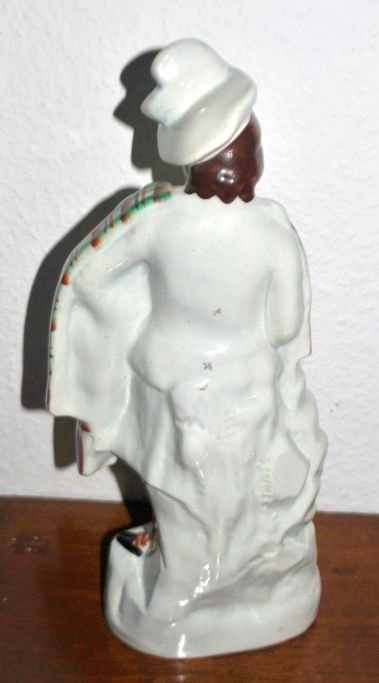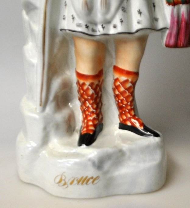 Staffordshire figur, 19. årh. England. Fajance. Polykrom dekoration forestillende den skotske konge Robert Bruce. Navnet er på foden. H.: 38 cm.Robert Bruce var konge over Skotland og slog kong Edward II in Bannockburn i 1314 og lavede fred i 1328. Han var inspirationskilde til en opera af Rossini opført i 1846. Her ses kongen i fuld skotsk beklædning med en hånd hvilende på et sværd.