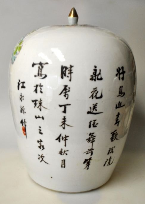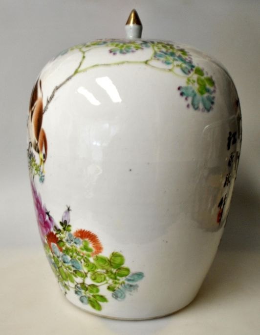 Kinesisk lågbojan, 19. årh. Håndmalet. Polykrom dekoration med fugle, blomster og tekst. Med låg med lågknop. Signeret. H: 32 cm.Perfekt stand!