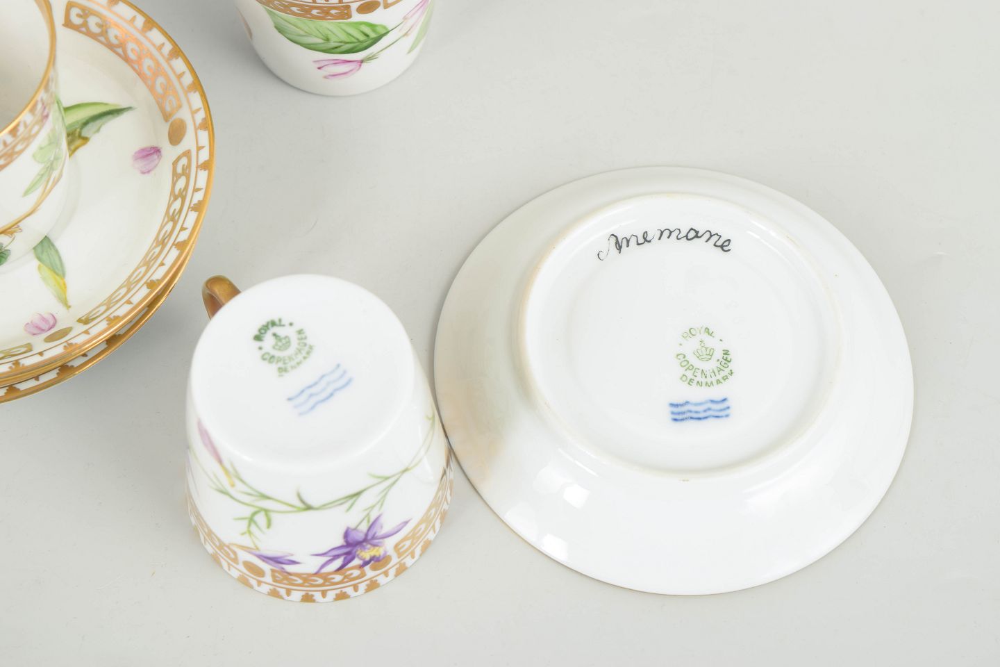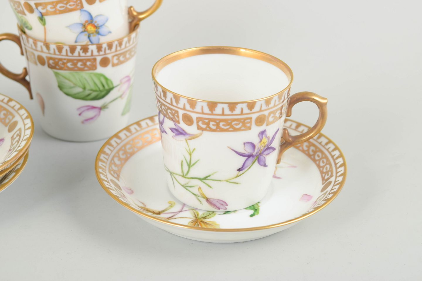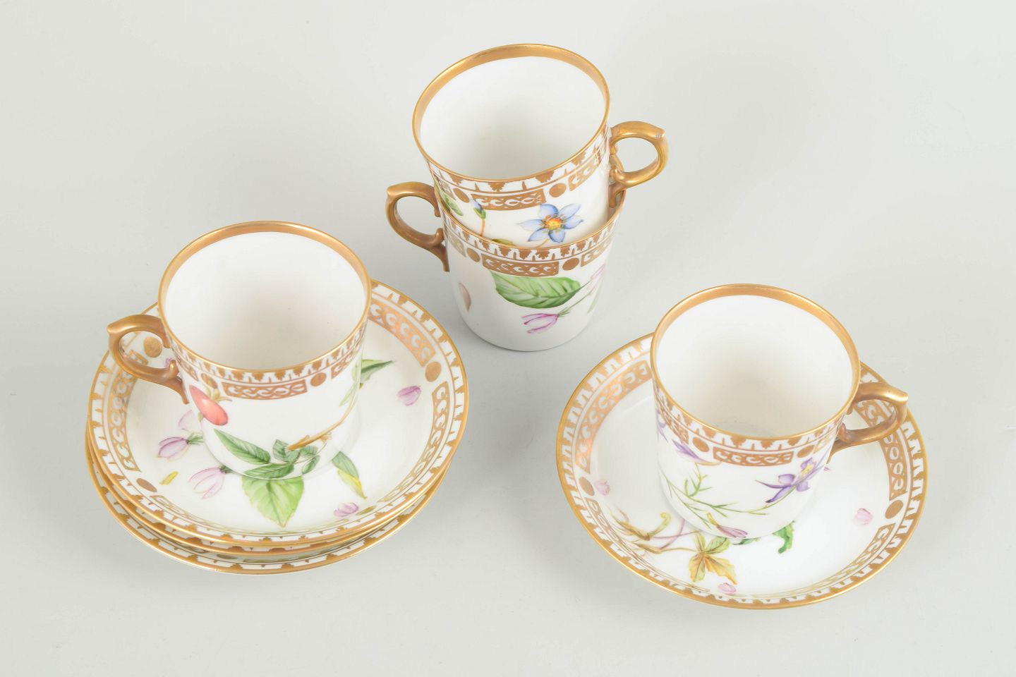 Royal Copenhagen, sæt på fire små kaffekopper med tilhørende underkopper.Porcelæn i Flora Danica-stil med håndmalede botaniske motiver og forgyldt kant.
