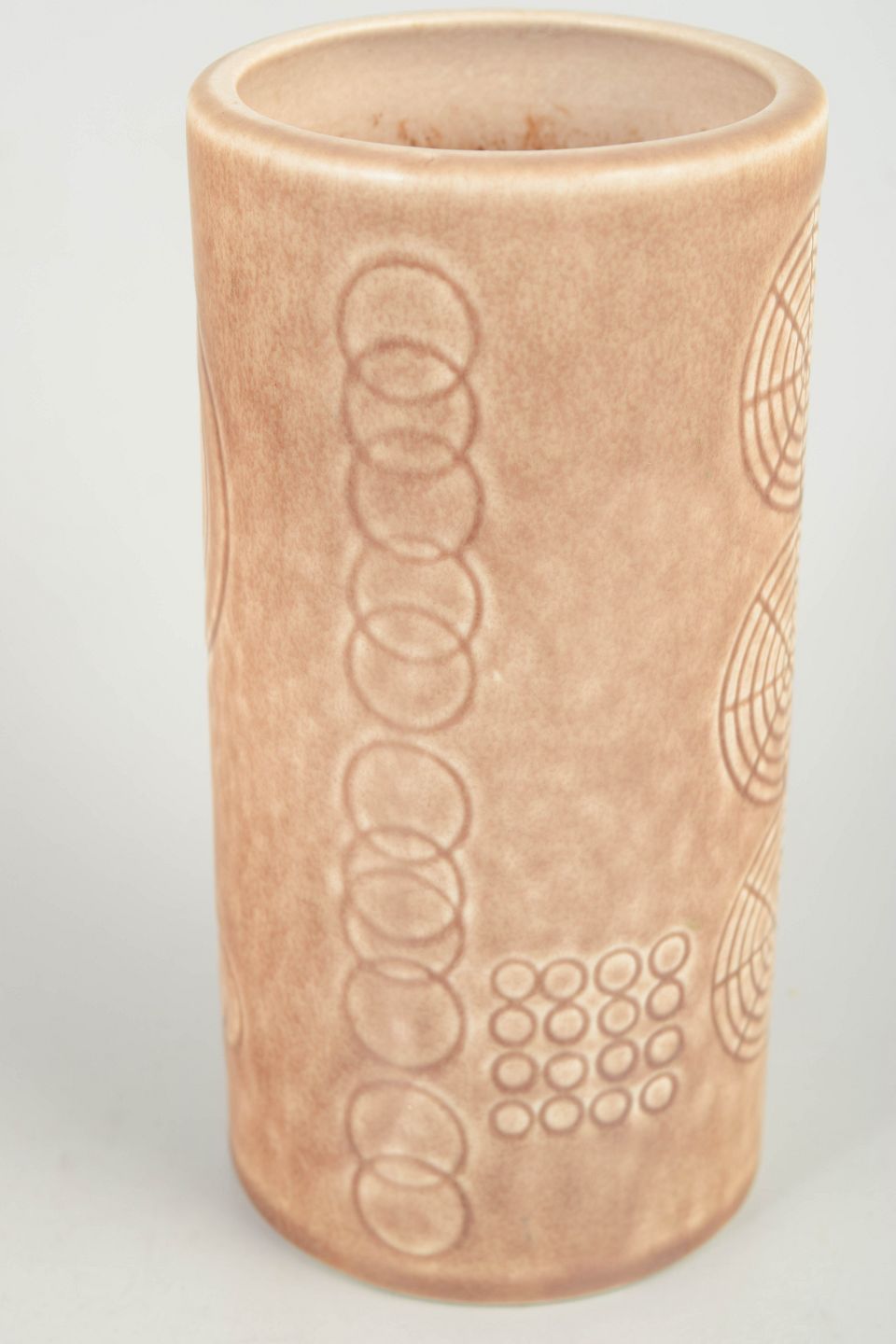 Olle Andersson for Rörstrand, vase, model “Sarek”.Cylinderformet vase i stentøj med mat, sandfarvet glasur og reliefdekoration med cirkulære og geometriske motiver. Modelnavn “Sarek” angivet i dekorationen.