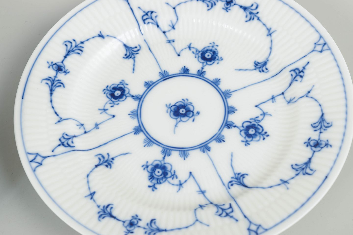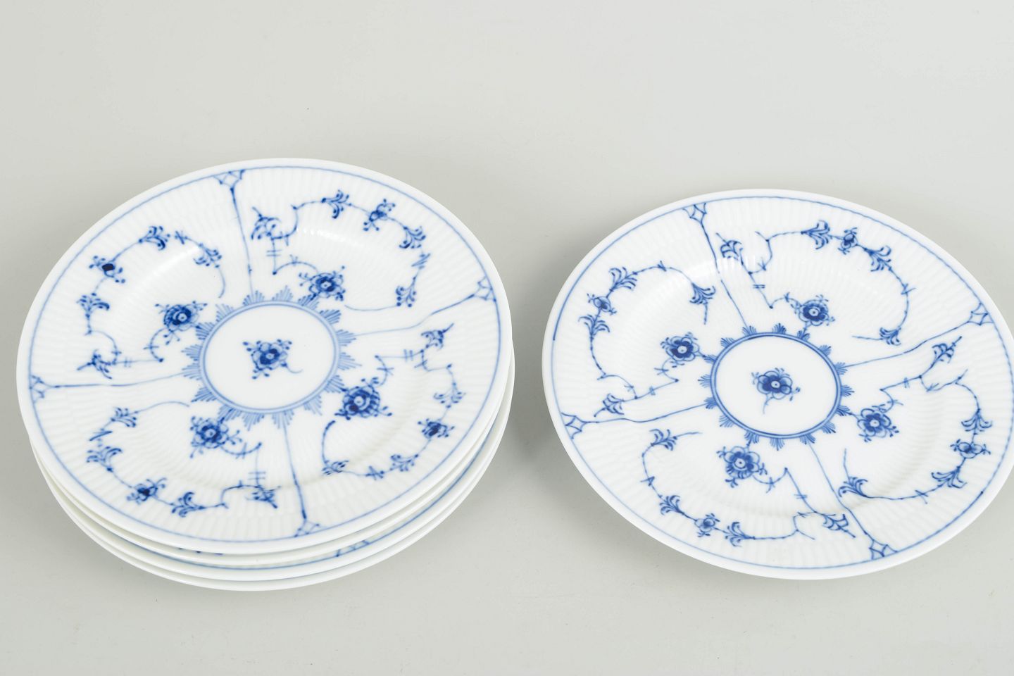 Royal Copenhagen, Musselmalet Riflet sæt på 5 kagetallerkener.Sæt på 5 runde kagetallerkener i porcelæn dekoreret i underglasurblåt med det klassiske Musselmalet Riflet-mønster. Model 1/180.