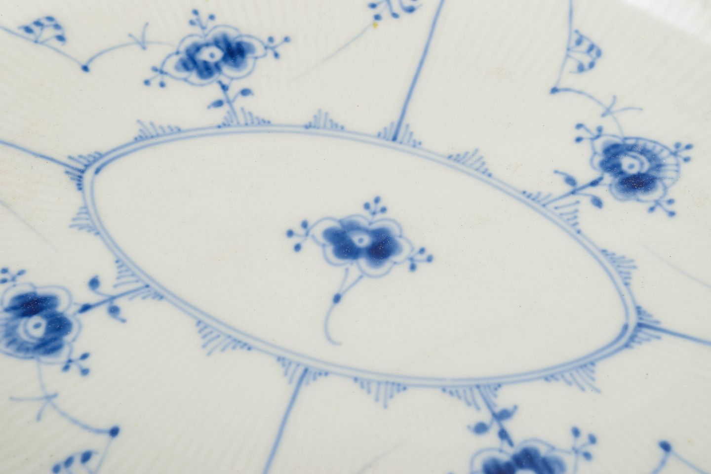 Royal Copenhagen, Musselmalet Riflet serveringsfad.Ovalt serveringsfad i porcelæn dekoreret i underglasurblåt med det klassiske Musselmalet Riflet-mønster. Model 1/99.