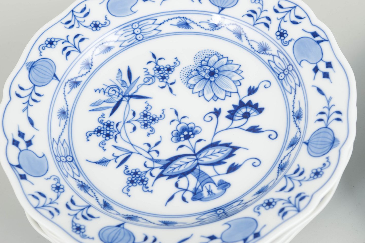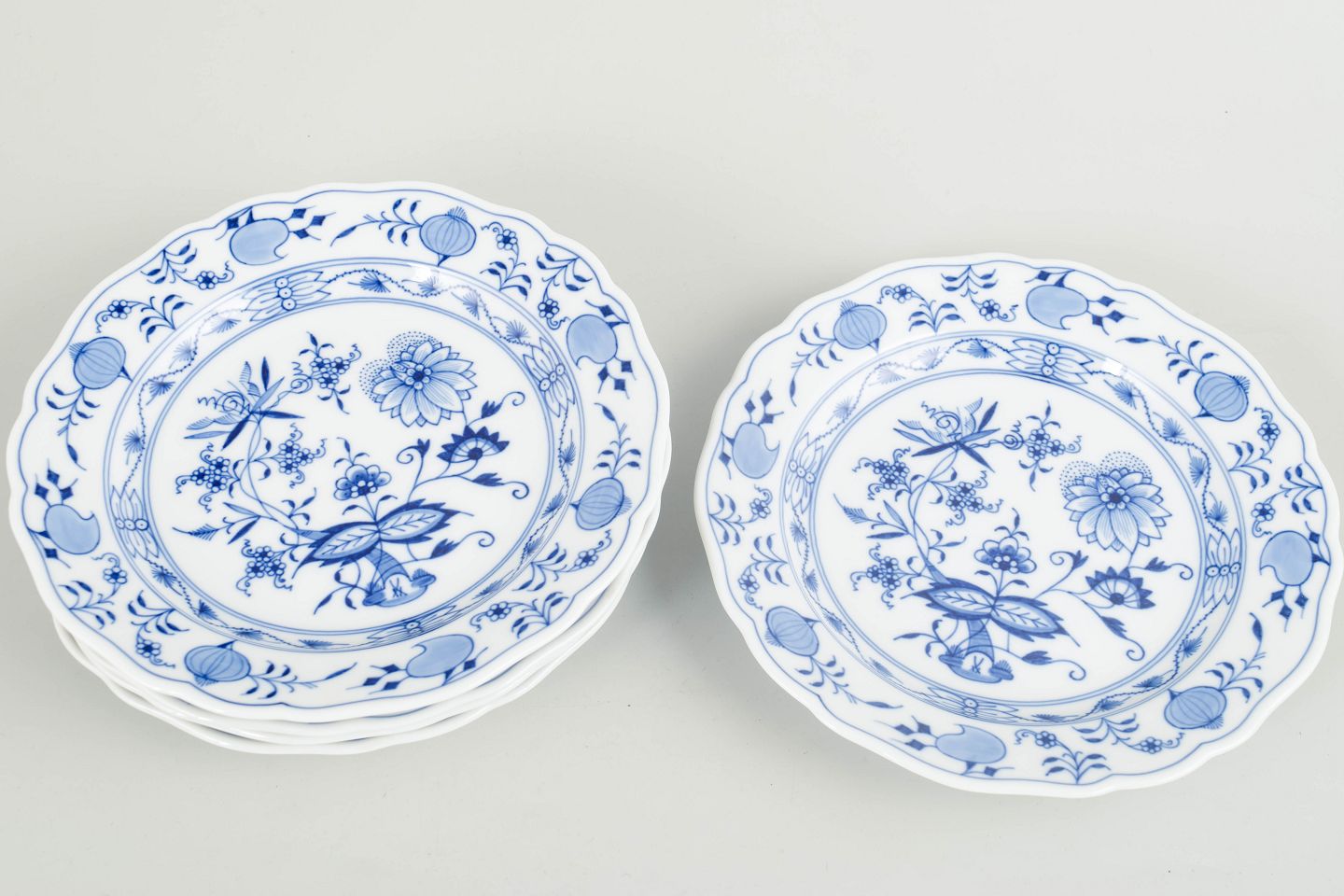 Meissen, Blå løgmønster, sæt på fem tallerkener.Tallerkener i porcelæn dekoreret med det klassiske blå løgmønster. Første fabrikskvalitet, mærket i bunden med Meissen krydsede sværd.