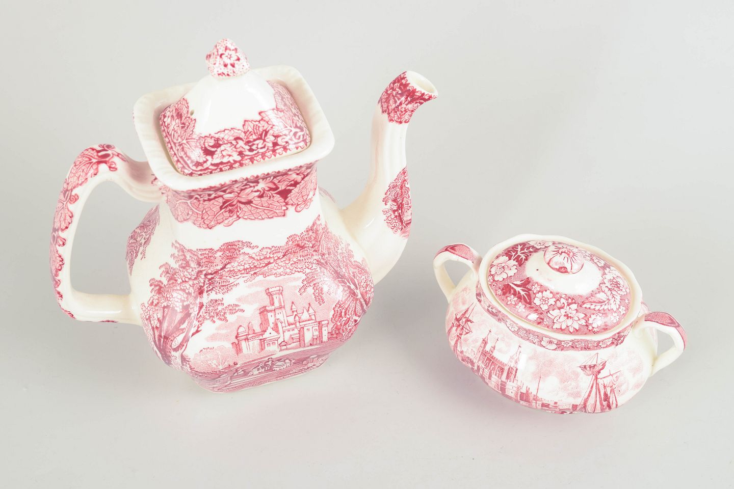 Sæt med kaffekande og sukkerskål, Mason’s og Palissy.Kaffekande og sukkerskål i fajance fra Mason’s og Palissy, dekoreret i rød transferware med landskabs- og arkitekturmotiver.