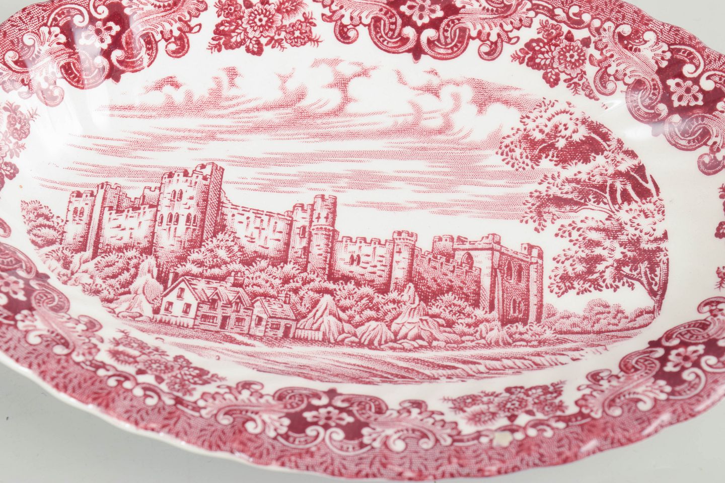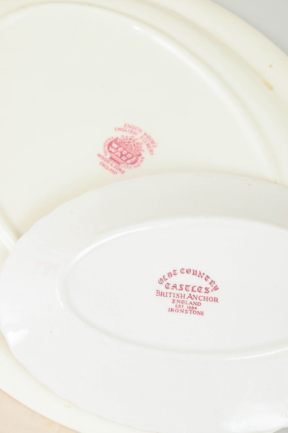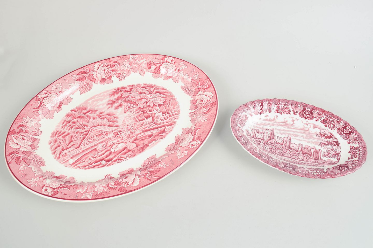 Sæt på 2 serveringsfade, Olde Country og Wood & Sons.Serveringsfade i fajance fra Olde Country og Wood & Sons, dekoreret i rød transferware med landskabs- og arkitekturmotiver samt ornamentale borter.