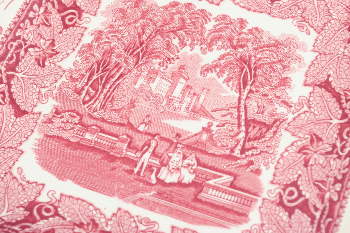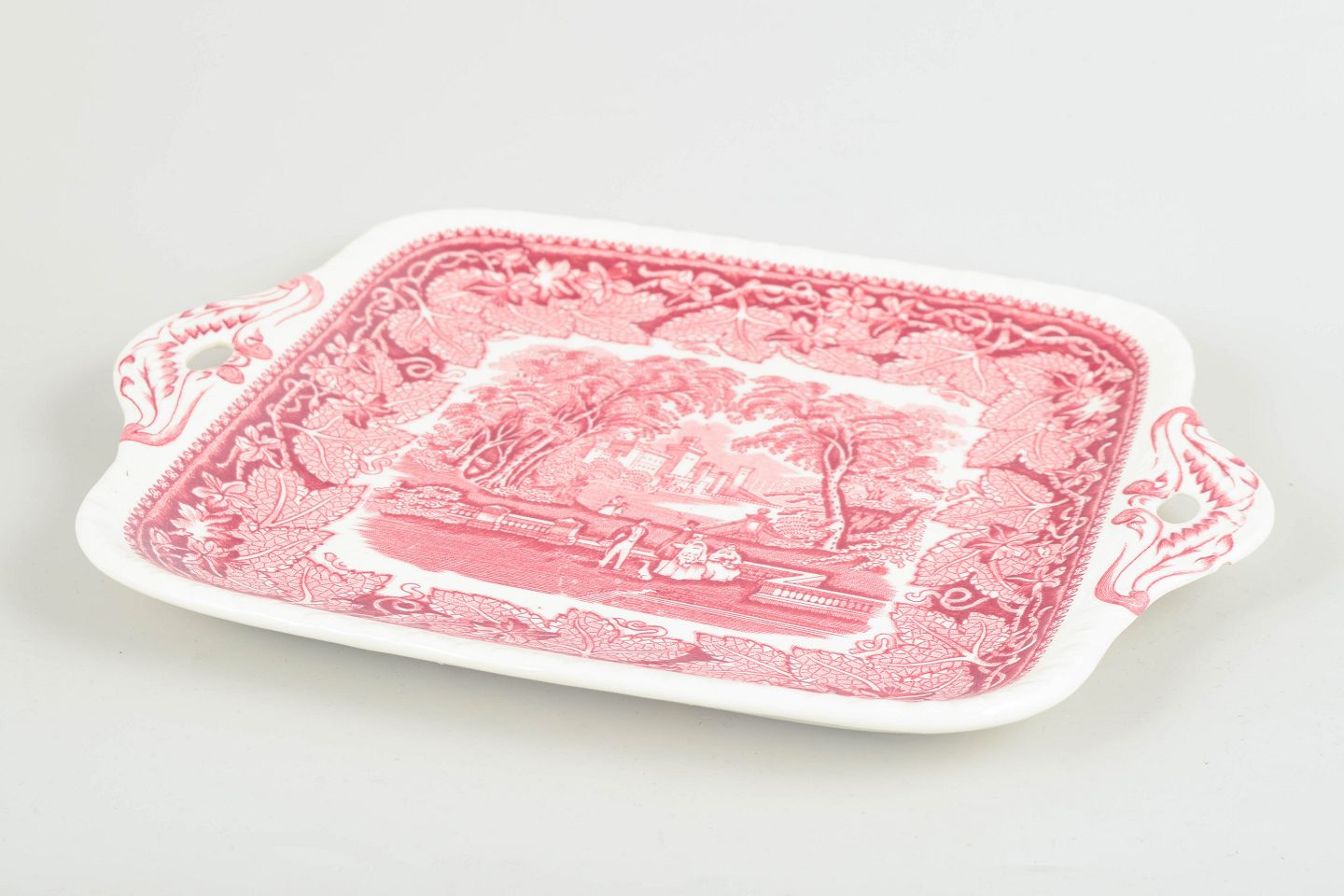 Mason’s, "Vista" bakke med håndtag.Rektangulær bakke i fajance fra Mason’s, dekoreret i rød transferware med landskabsmotiv og ornamental bladbort.