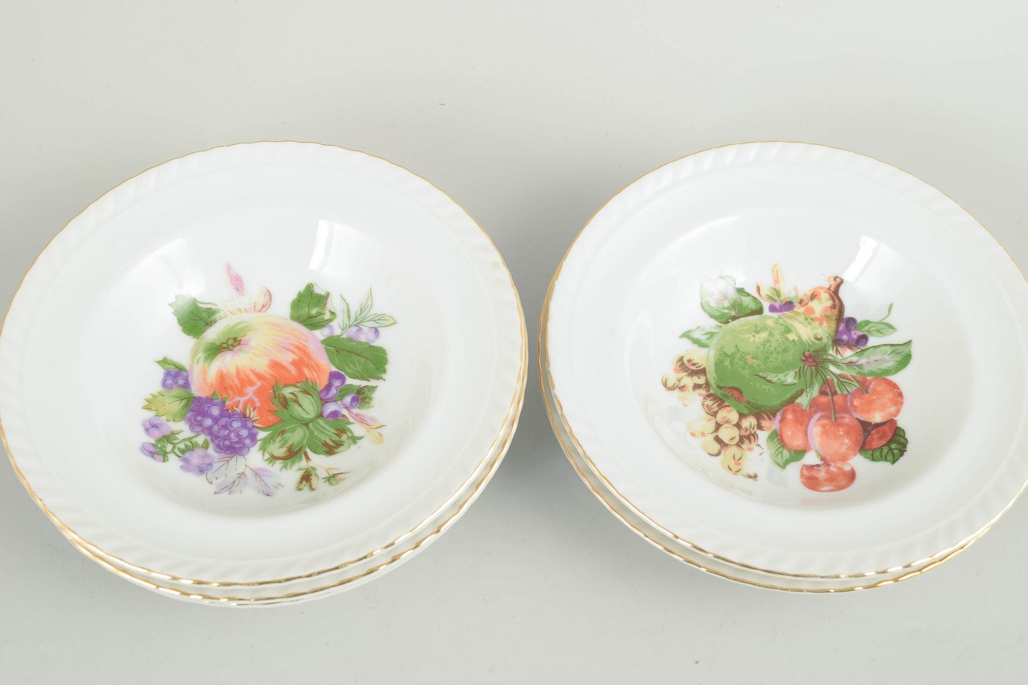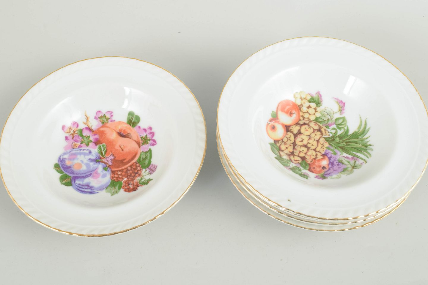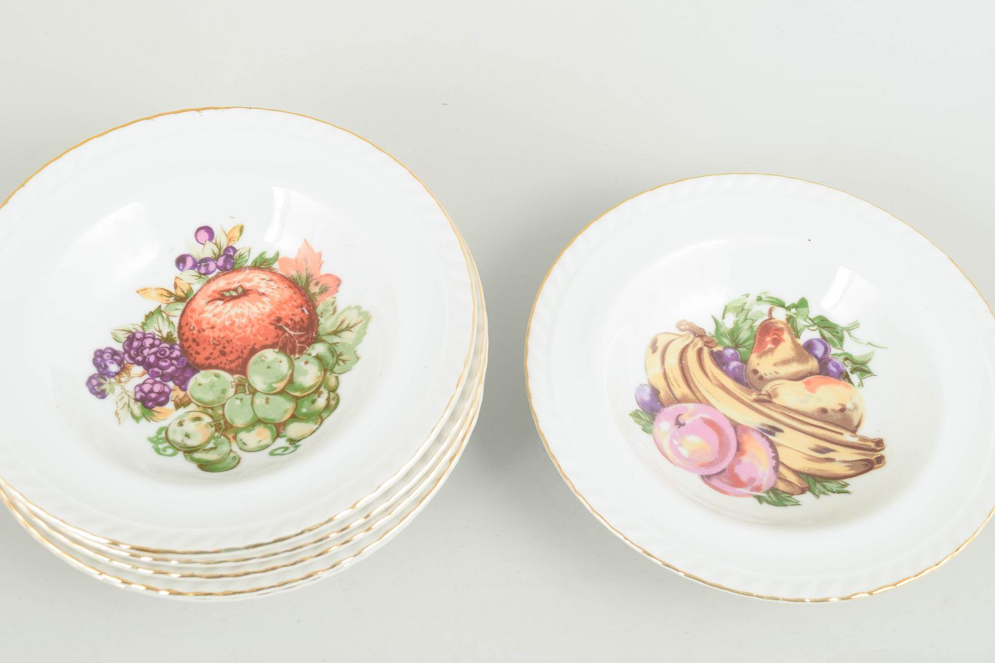Europæisk porcelænsproducent, sæt på 6 skåle.Sæt af seks porcelænsskåle dekoreret med polykrom frugtdekoration og guldkant. Klassisk europæisk bordporcelæn i tidstypisk mellemkrigsstil. Mærket på undersiden.