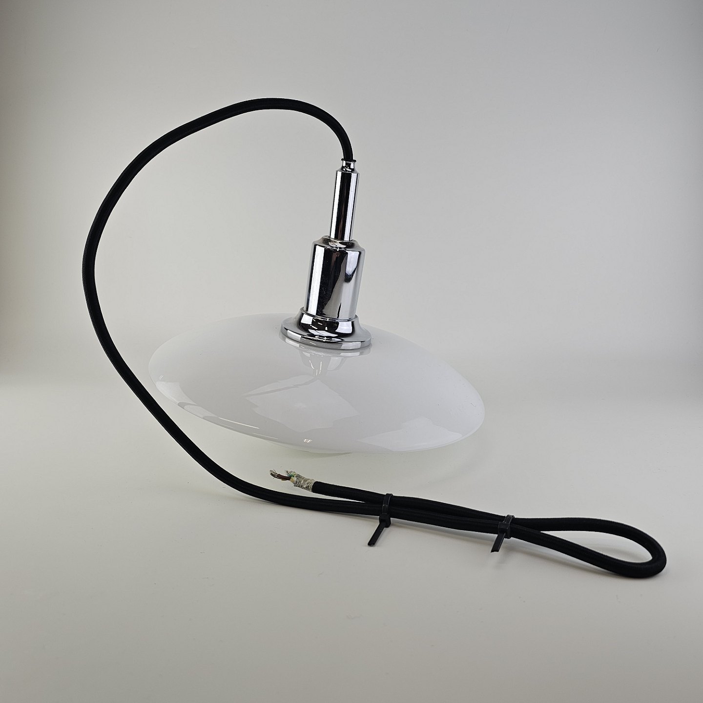 Loftlampe i hvidt opal glas med fatning i forkromet metalFormgiver Poul Henningsen (1894-1967)