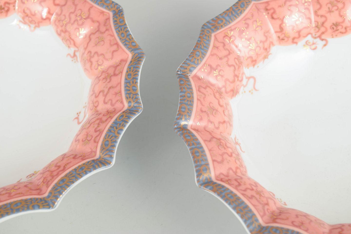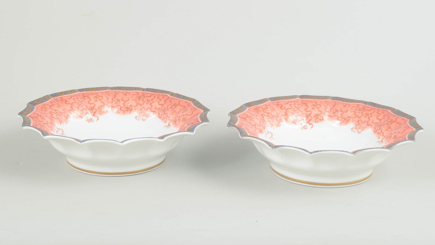 Royal Copenhagen, Fairytale, 2 skåle.To lave skåle i hvidt porcelæn dekoreret med Fairytale-mønster i bløde rosa toner langs den bølgede kant. 1. sortering. Model 351.