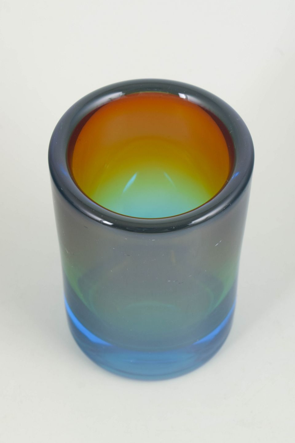 Gösta Sigvard for Lindshammars glasbruk, vase.Cylindrisk kunstglasvase i kraftigt klart glas med flerfarvet overgang i blå, grønne og varme toner. Modellen er kendetegnet ved en tung bund og jævnt slebne kanter.