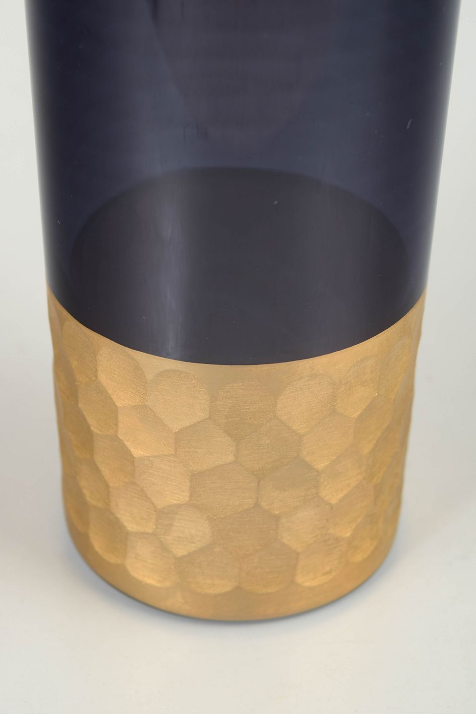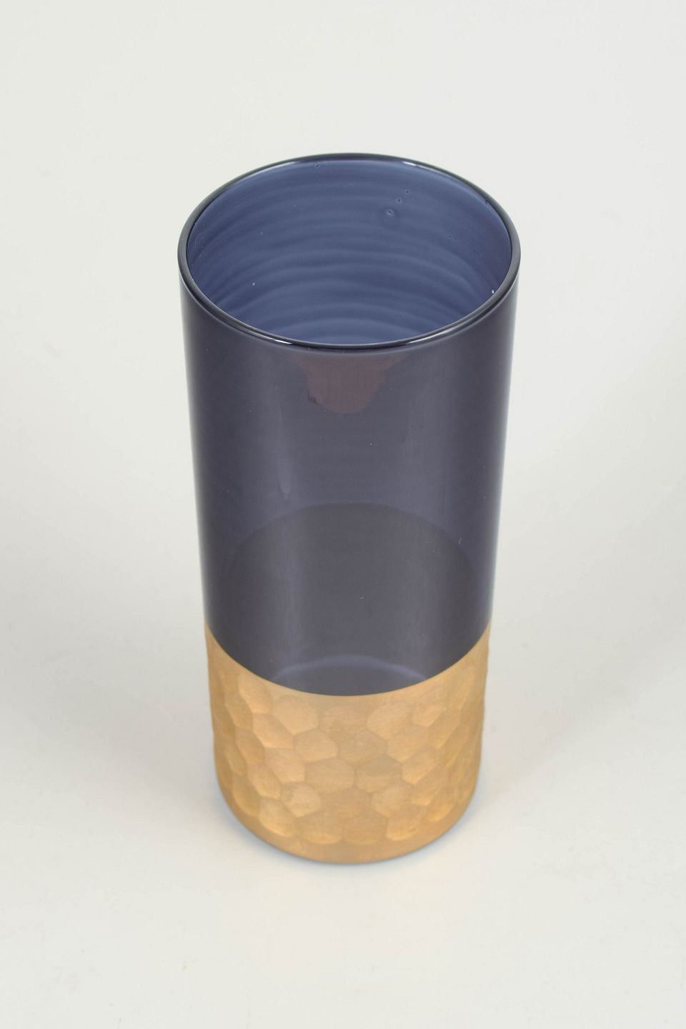 Europæisk kunstglasvase.Cylinderformet vase i mundblæst glas med klar kobaltblå overdel og kraftig bund i hamret, forgyldt metal. Enkel, stram form med tydelig kontrast mellem det transparente glas og den teksturerede metalfod. Uden signatur.