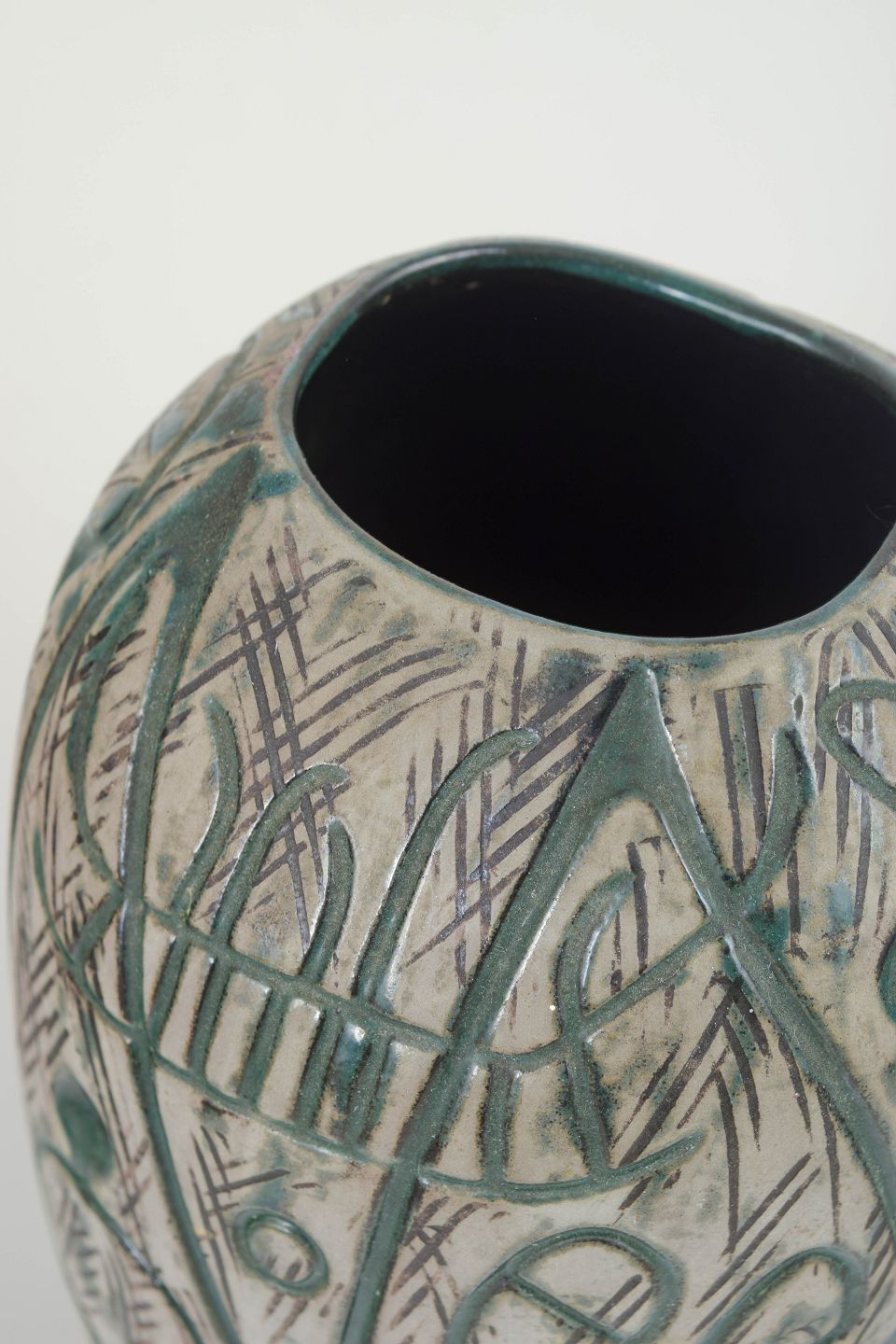 Mari Simmulson for Upsala Ekeby, "Hedenhös" vase.Dekorativ stentøjsvase med karakteristisk reliefdekoration i grønne og grå nuancer. Vasen er udført i serien Hedenhös og er formgivet med organiske linjer og indridset mønster. Model 4305.