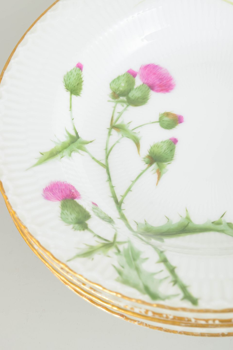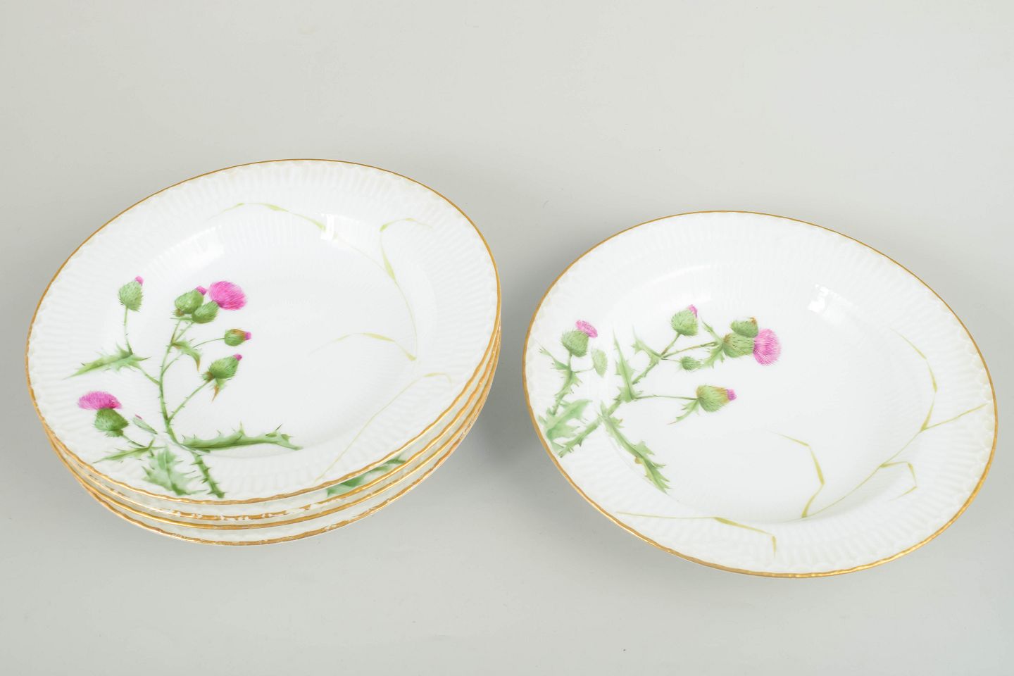 Royal Copenhagen, sæt på 5 antikke store dybe tallerkener.Håndmalede store dybe porcelænstallerkener med naturalistisk dekoration med tidselmotiv og forgyldt rand. Tallerkenerne har let riflet overflade og afspejler det høje håndværksmæssige niveau, som kendetegner Royal Copenhagens produktion i anden halvdel af 1800-tallet.