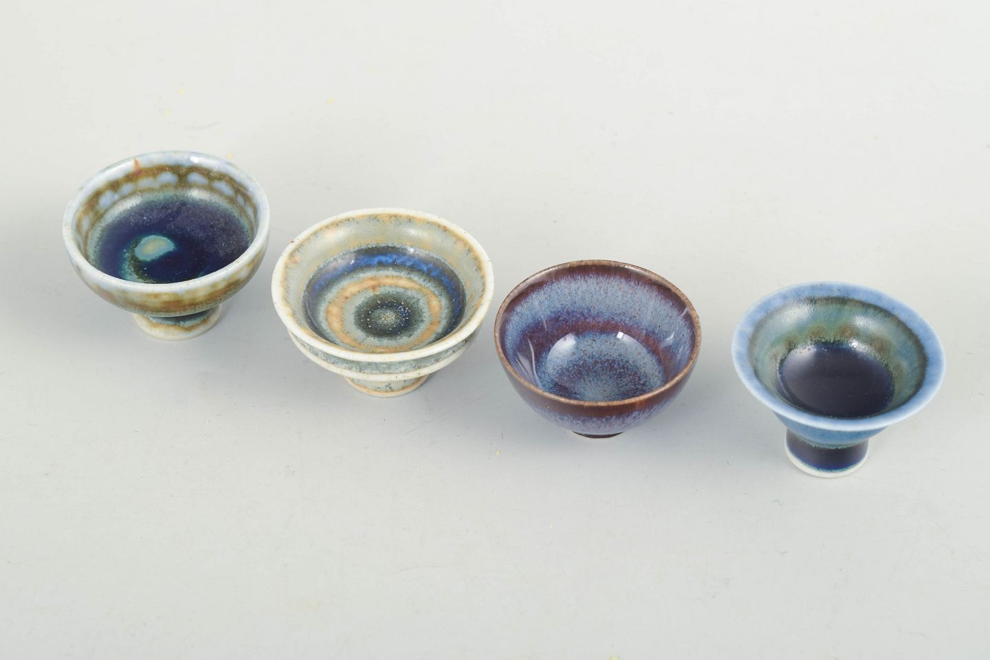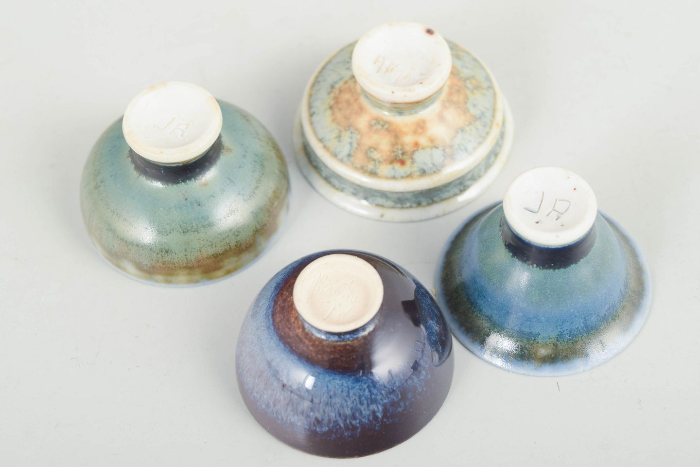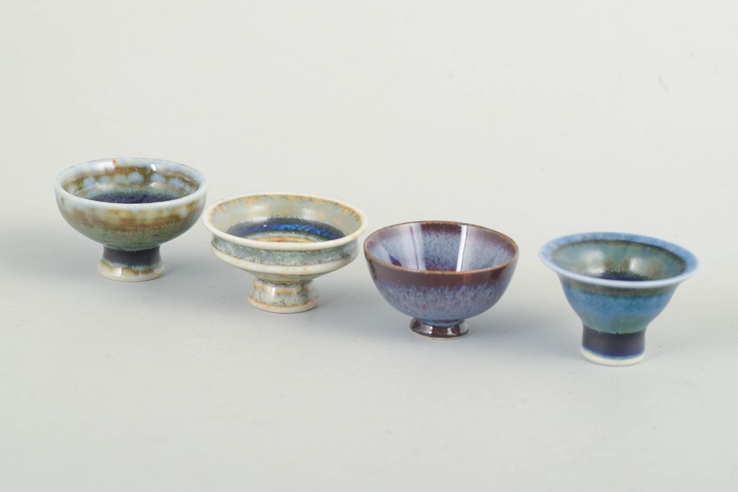John Andersson for Höganäs Keramik, sæt af fire unikke miniature skåle.Sæt af fire unikke miniature skåle i drejet stentøj med individuelle glasurer i afdæmpede blå, grønne og violette toner. Alle skåle er signeret med monogram JA på bunden.