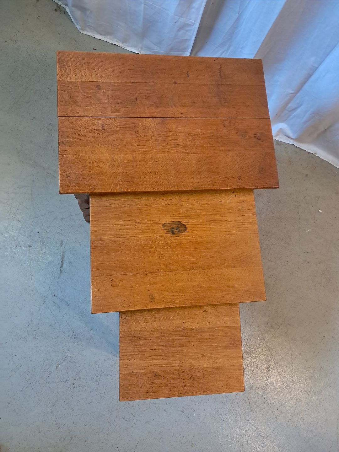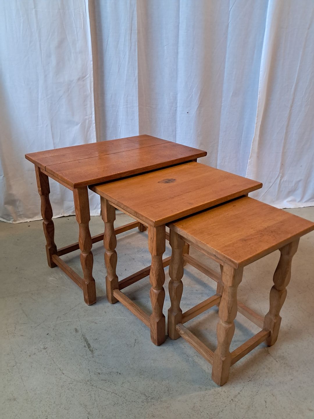 3 Indskudsborde i massivt egetræ, fra 1980erne.De har brugsspor og en revne.