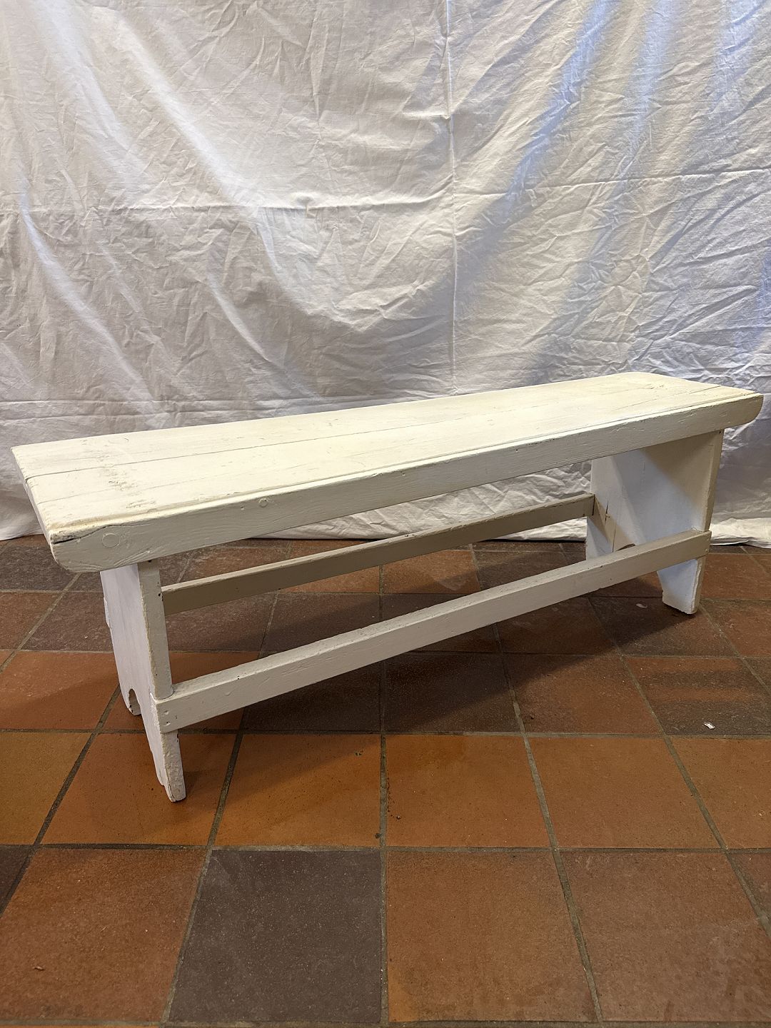 Antik vaskebænk i hvidmalet fyrretræ fremstillet ca. år 1900Brugt stand, fremstår med skævhed og senere bemaling.
