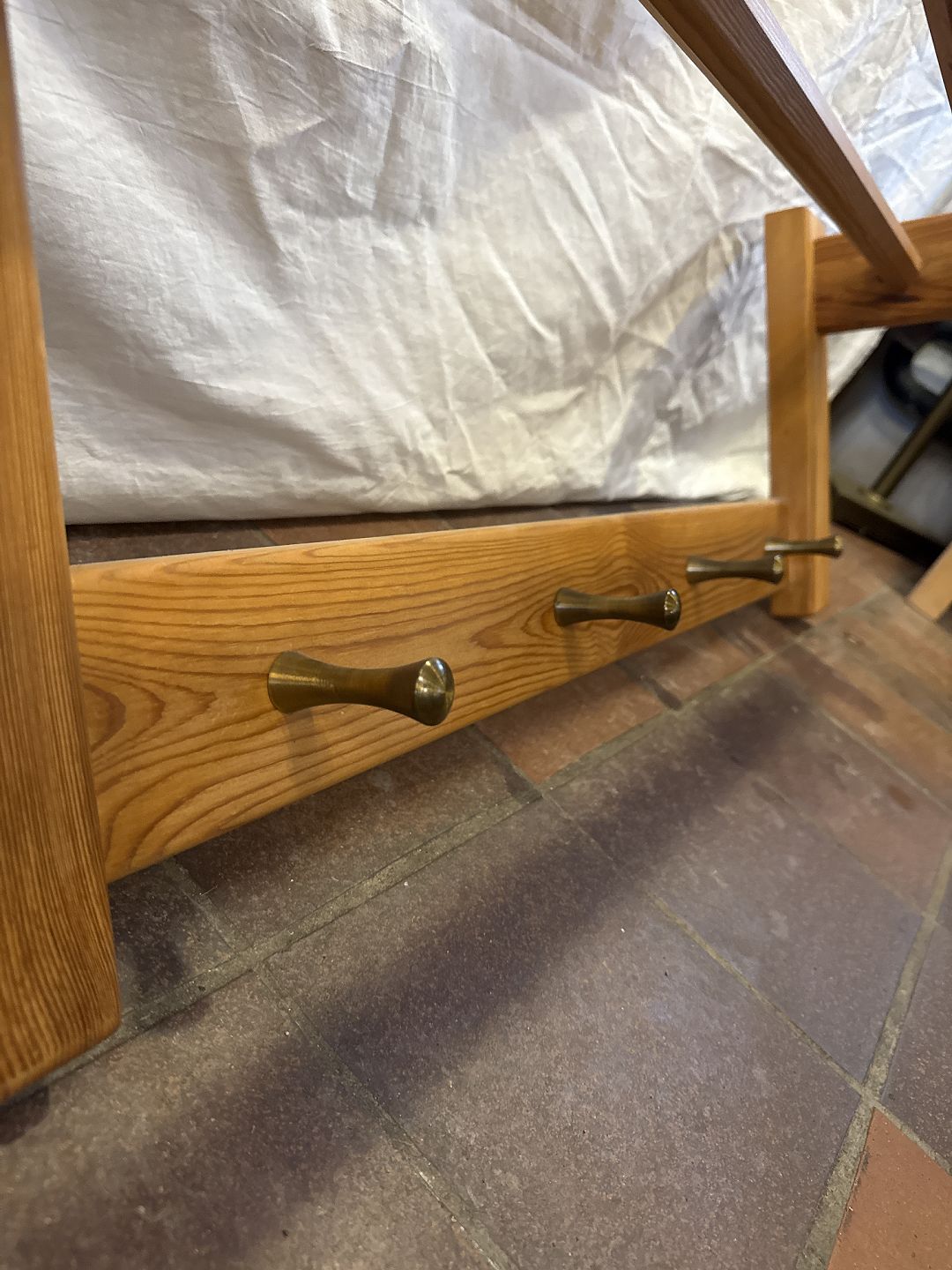 Svensk design væghængt knagerække/hattehylde i massiv fyr og knager i messing.Produceret ca. 1970'erne.