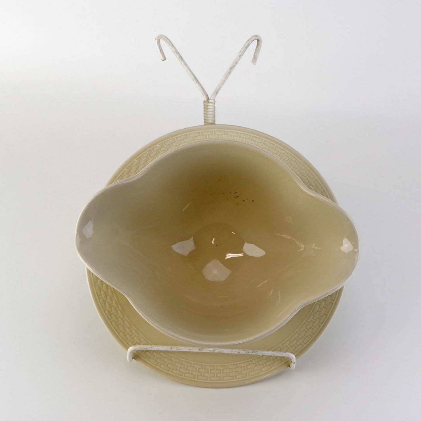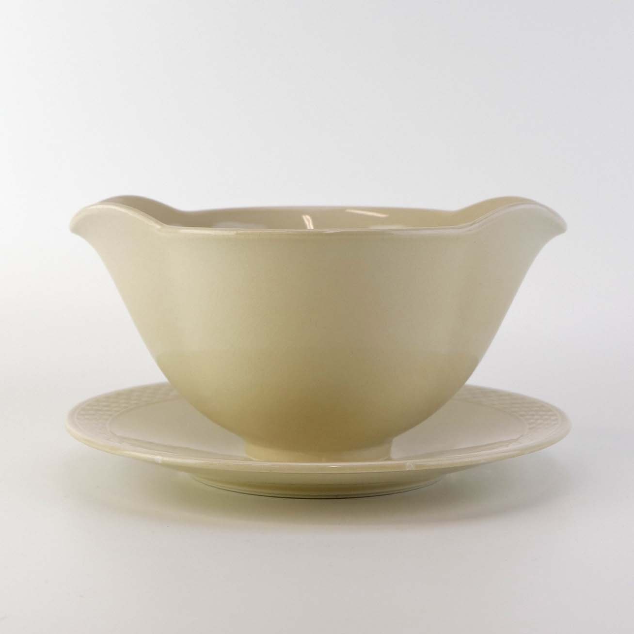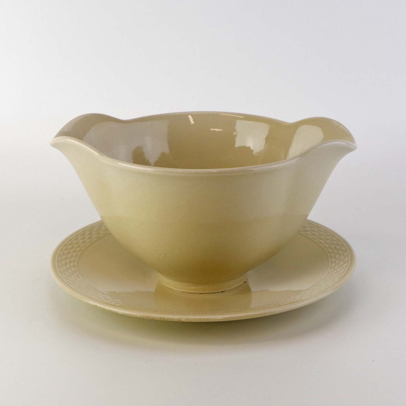Sandfarvet fajancestel i stelform Viktoria II - Fletværk med dekoration af hvidt flet på gullig baggrund.