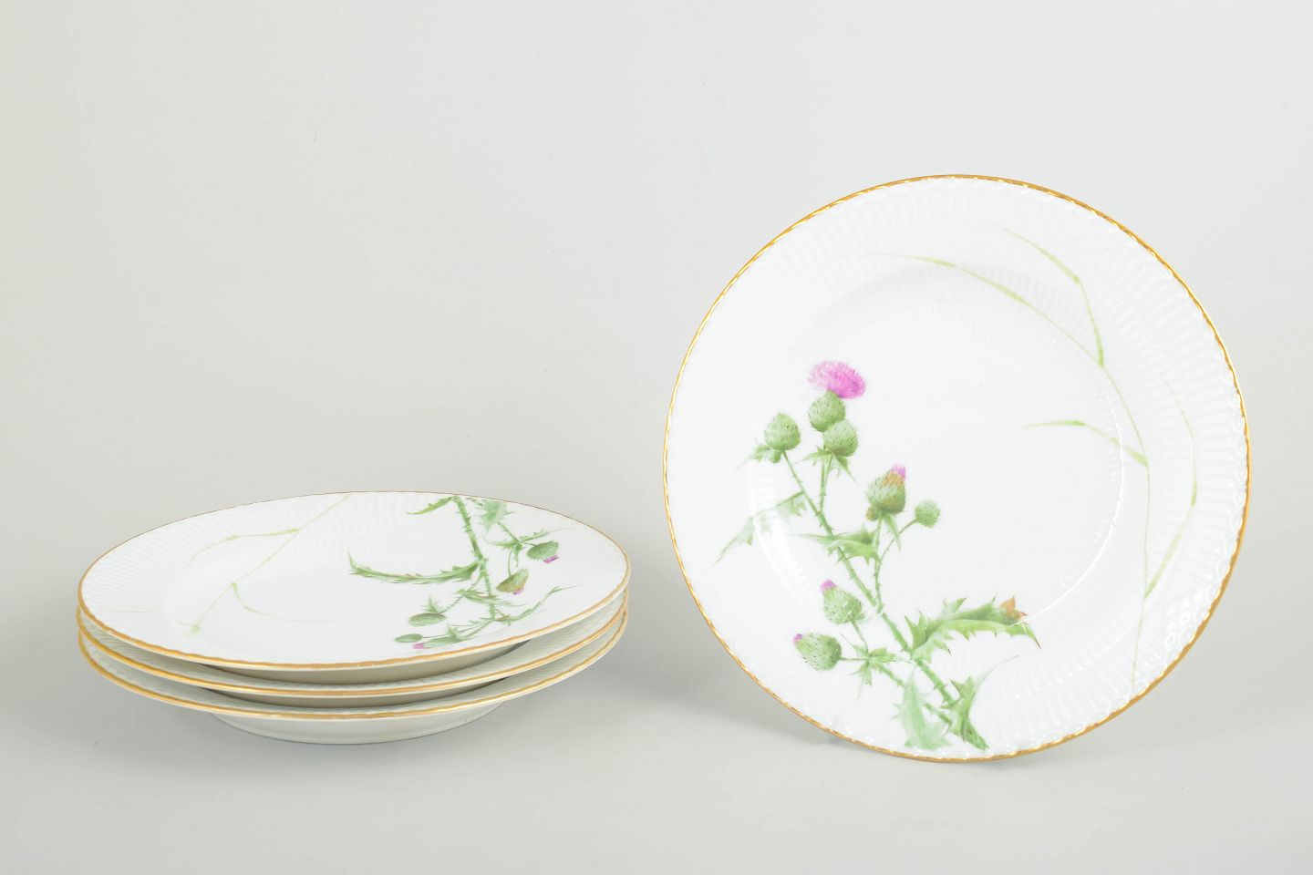 Royal Copenhagen Tidsel, sæt af fire middagstallerkener.Sæt af fire middagstallerkener i håndmalet porcelæn fra Tidsel serien. Dekoreret med naturalistisk tidselmotiv i grønne og rosa nuancer samt forgyldt kant. Første sortering.