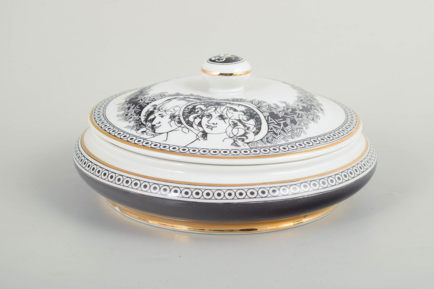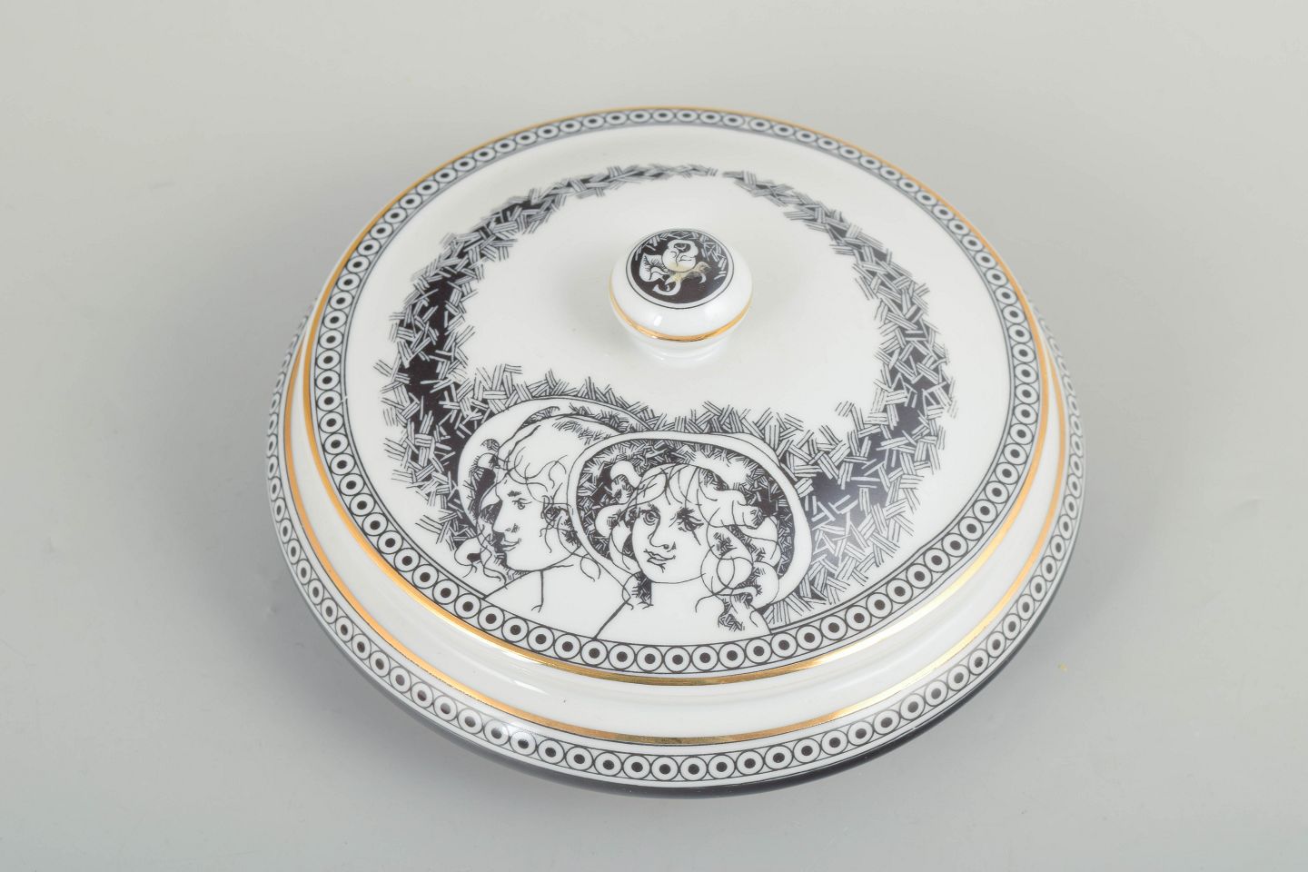 Hollóháza, lågskål.Rund skål med låg i hvidglaseret porcelæn med sort dekorationsbort og figurmotiv på låget. Fremstillet hos Hollóháza Porcelænsmanufaktur.